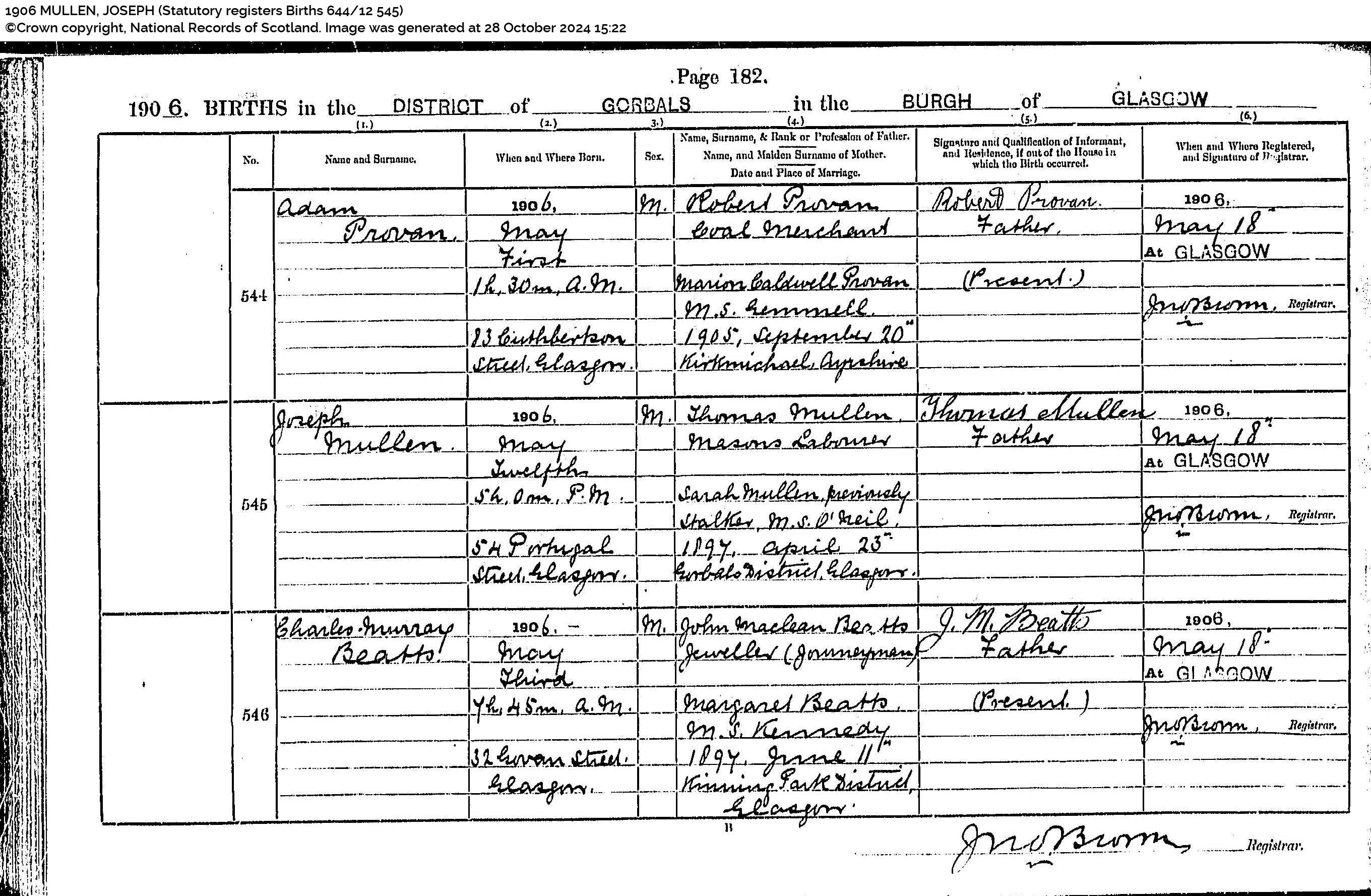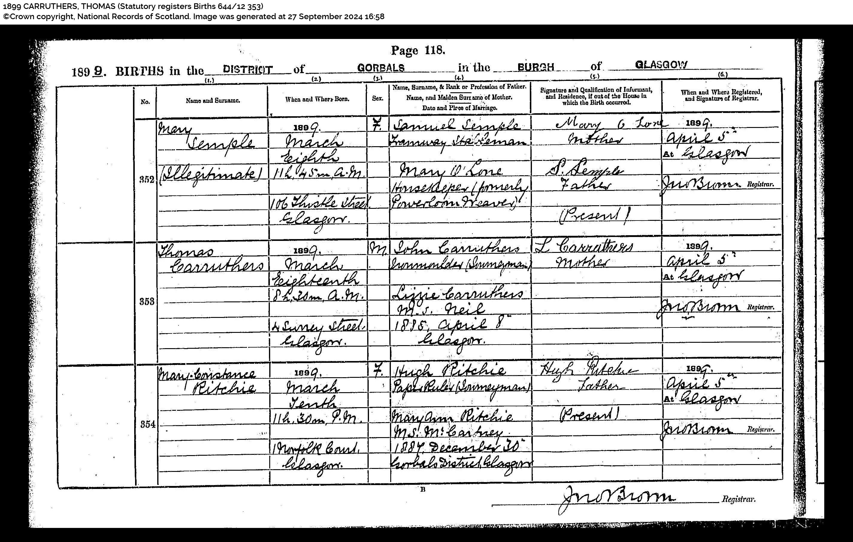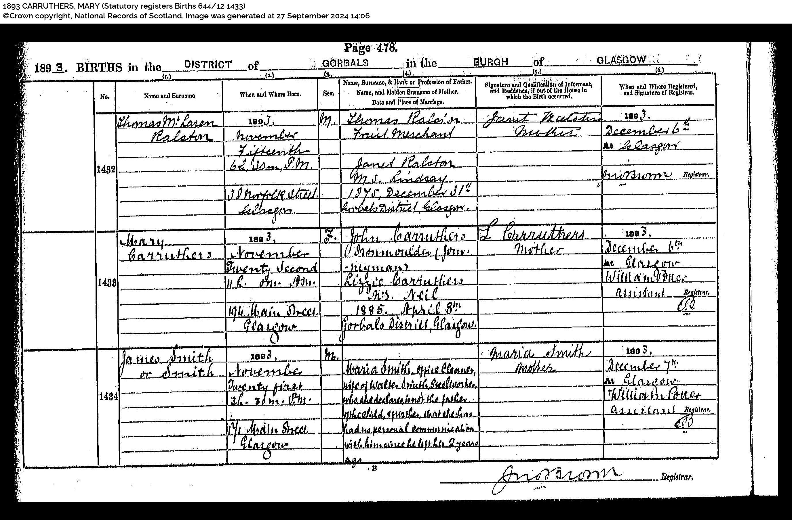Mary Carruthers (born) 22 November 1893 11h 0m an (at) 194 Main Street, Glasgow (daughter of) John Carruthers, Iron Moulder (Journeyman) and Lizzie Carruthers MS Neil (informant) signed L Carruthers, Mother. (Registered) 1893 December 6 at GlasgowRegistrar William Potter