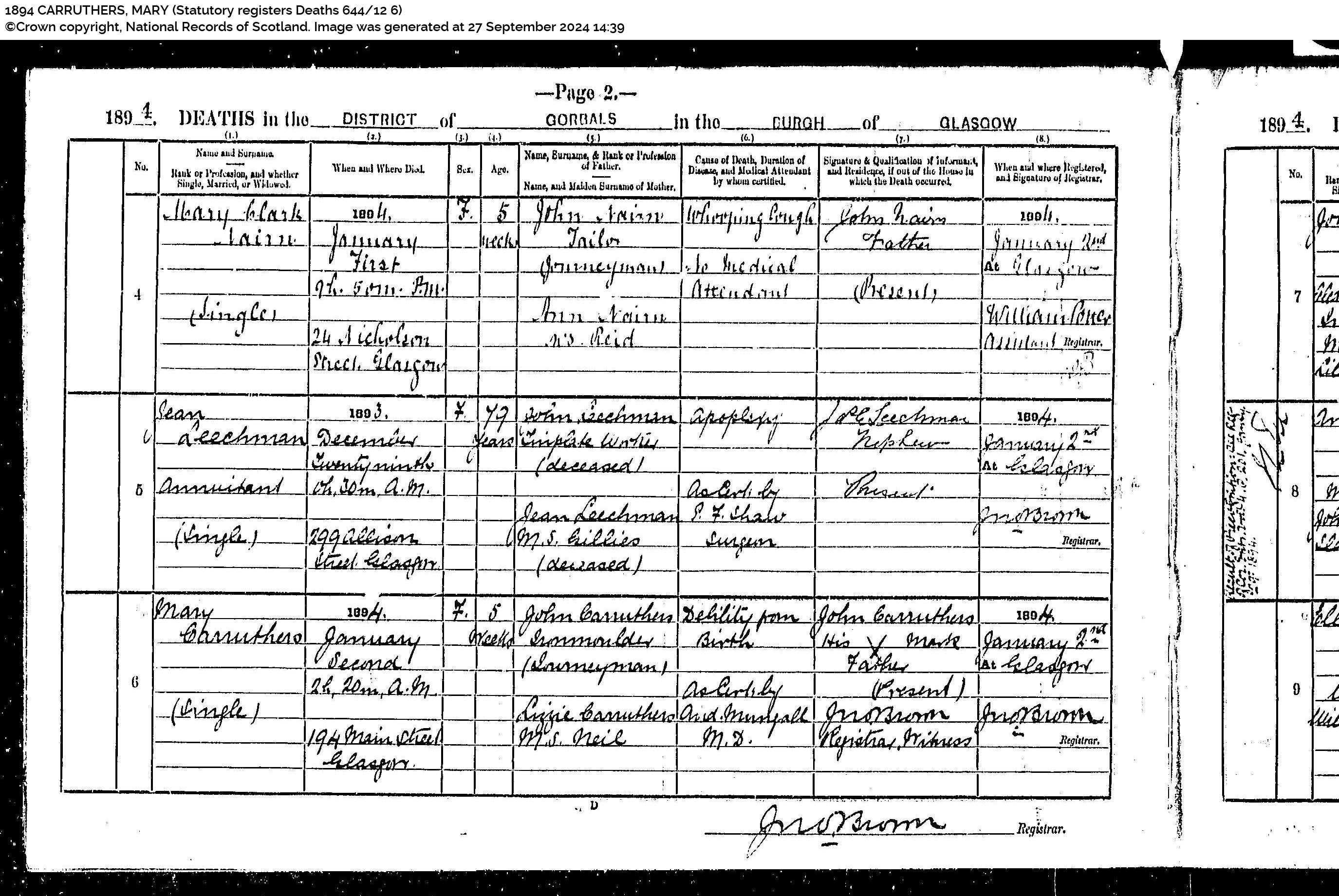 Mary Carruthers (Single)(died) 2 January 1894 (at) 2h 20m am (at) 194 Main Street, Glasgow (aged) 5 weeks (daughter of) John Carruthers Iron Moulder (Journeyman) and Lizzie Carruthers MS Neil. (cause of death) Debility from Birth (Certified by) Andrew Murryall MD. (informant) John Carruthers, his (x) mark, Father (Present) (Registered 2 Jan 1894 at Glasgow. (Registrar) Jno Brown.