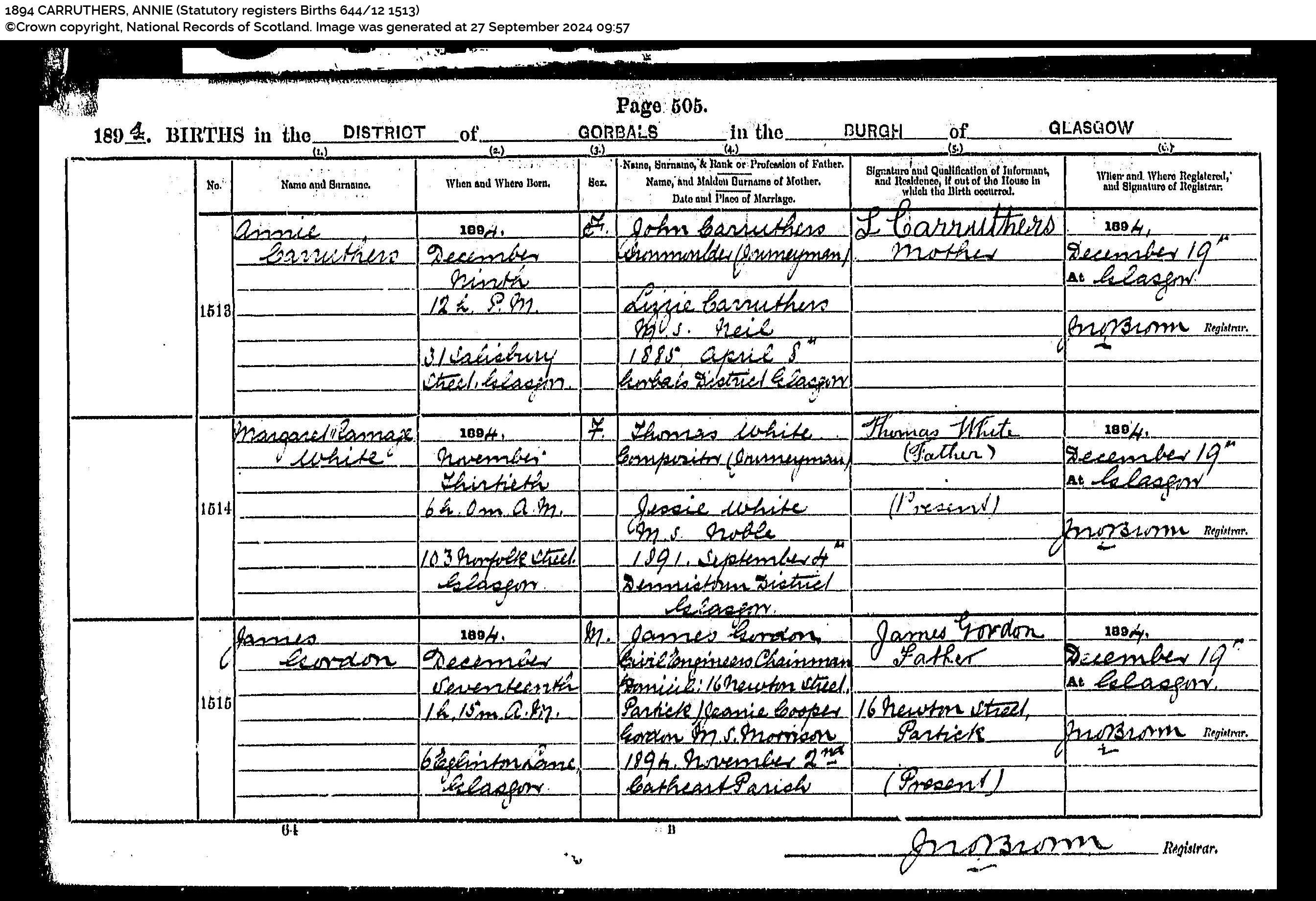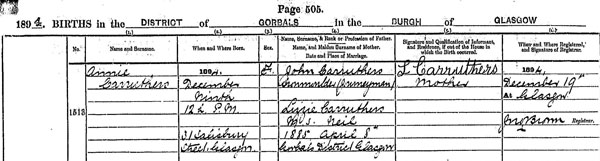 Annie Carruthers (born) 9 December 1894 (at) 12h pm (at) 31 Salisbury Street, Glasgow (daughter of) John Carruthers Iron Moulder (Journeyman) and Lizzie Carruthers MS Neil (married) 1885 April 8th Gorbals District, Glasgow. (Informant Signed) L Carruthers, Mother. (registered) 1894 December 19 at Glasgow. (Registrar) Jno Brown