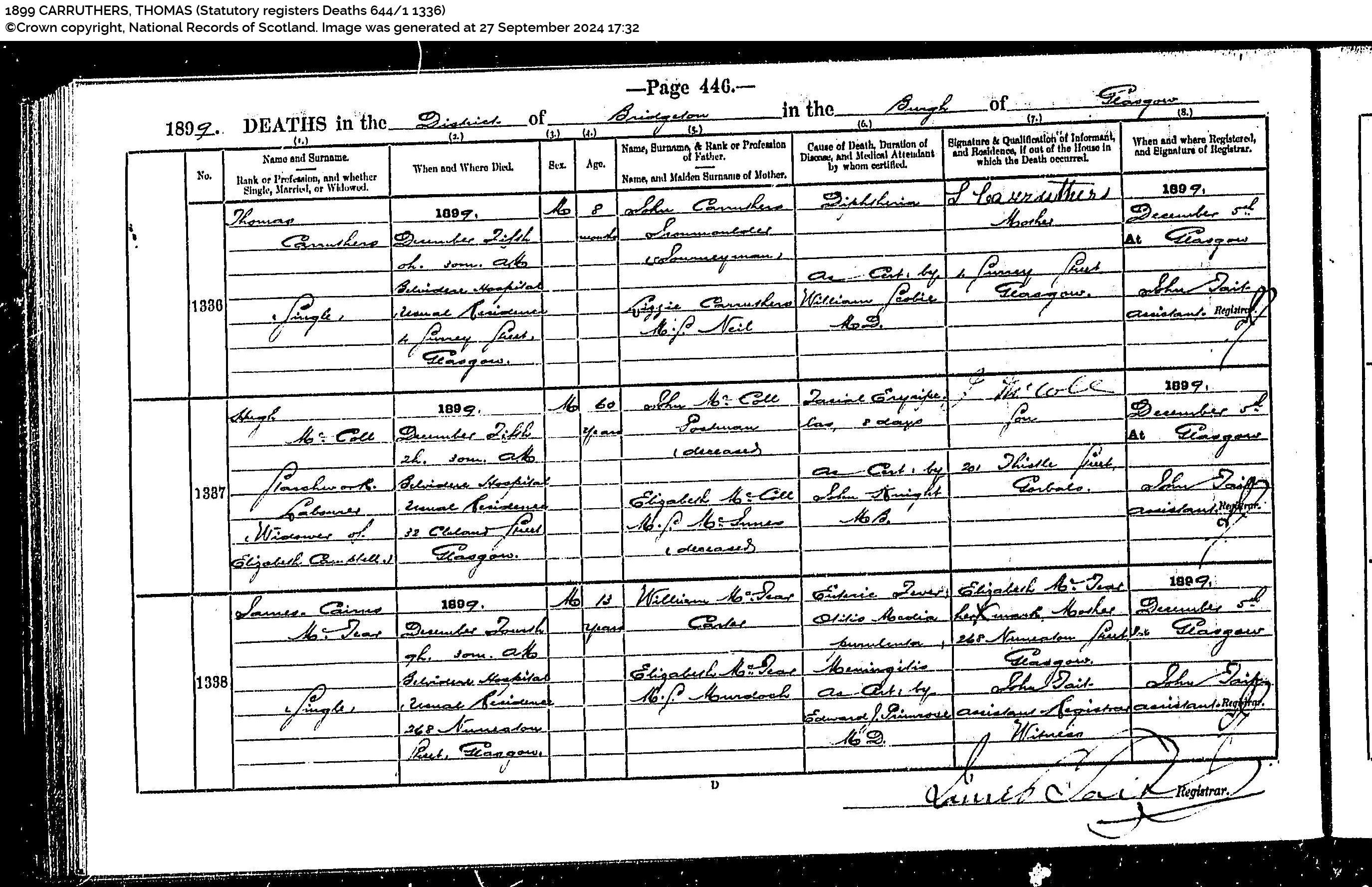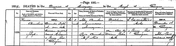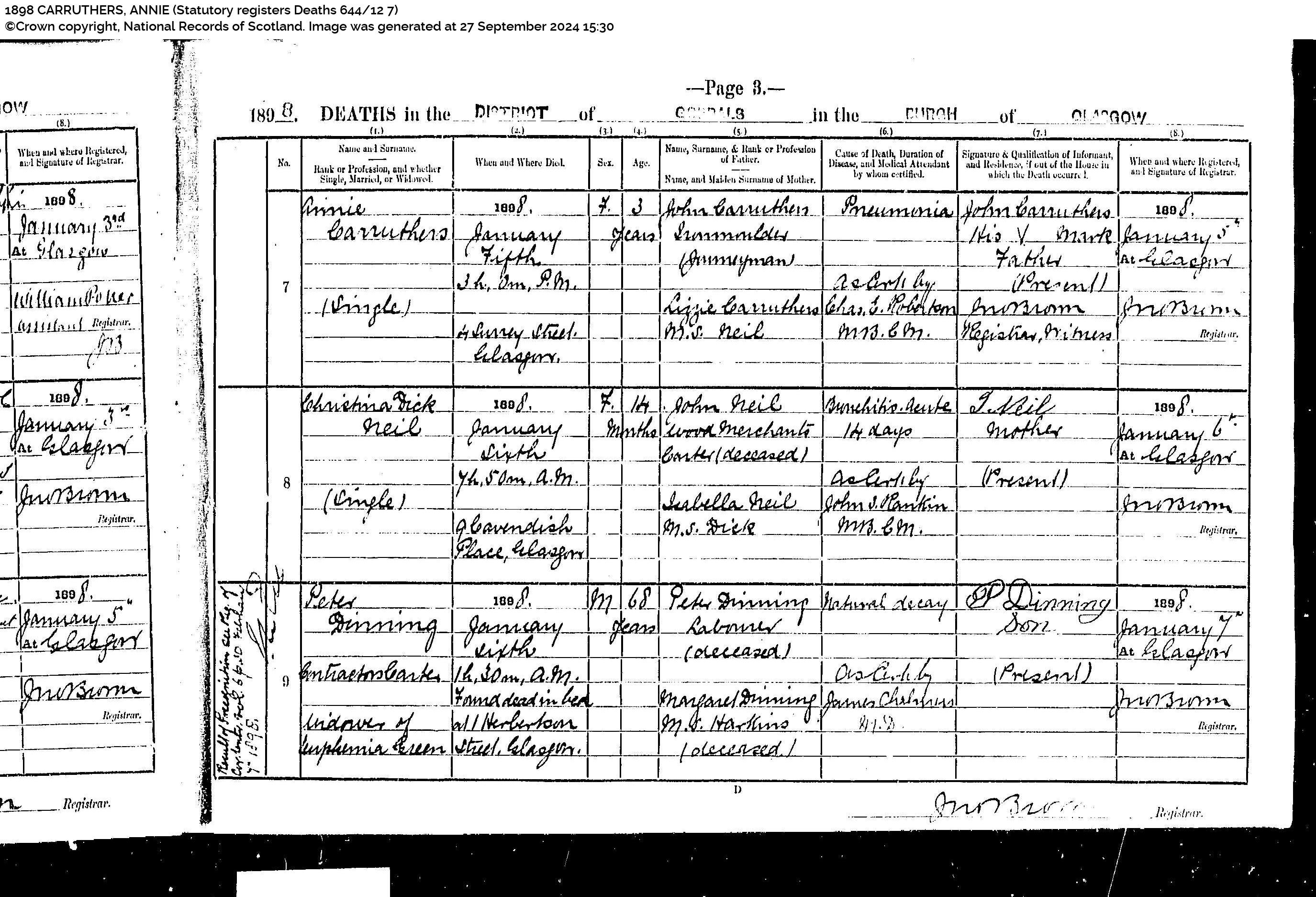 Annie Carruthers (died) 4 January 1898 (at) 3h 0m PM (at) 4 Surrey Street, Glasgow (age) 3 (daughter of) John Carruthers, Iron moulder Journeyman and Lizzie Carruthers MS Neil (cause of death) Pneumonia (as cert by) Chas J Robertson MB CM (Informant) John Carruthers his (x) mark, Father, Present. (Witness) Jno Brown (Registered) 5 Jan 1898 at Glasgow (registrar) Jno Brown