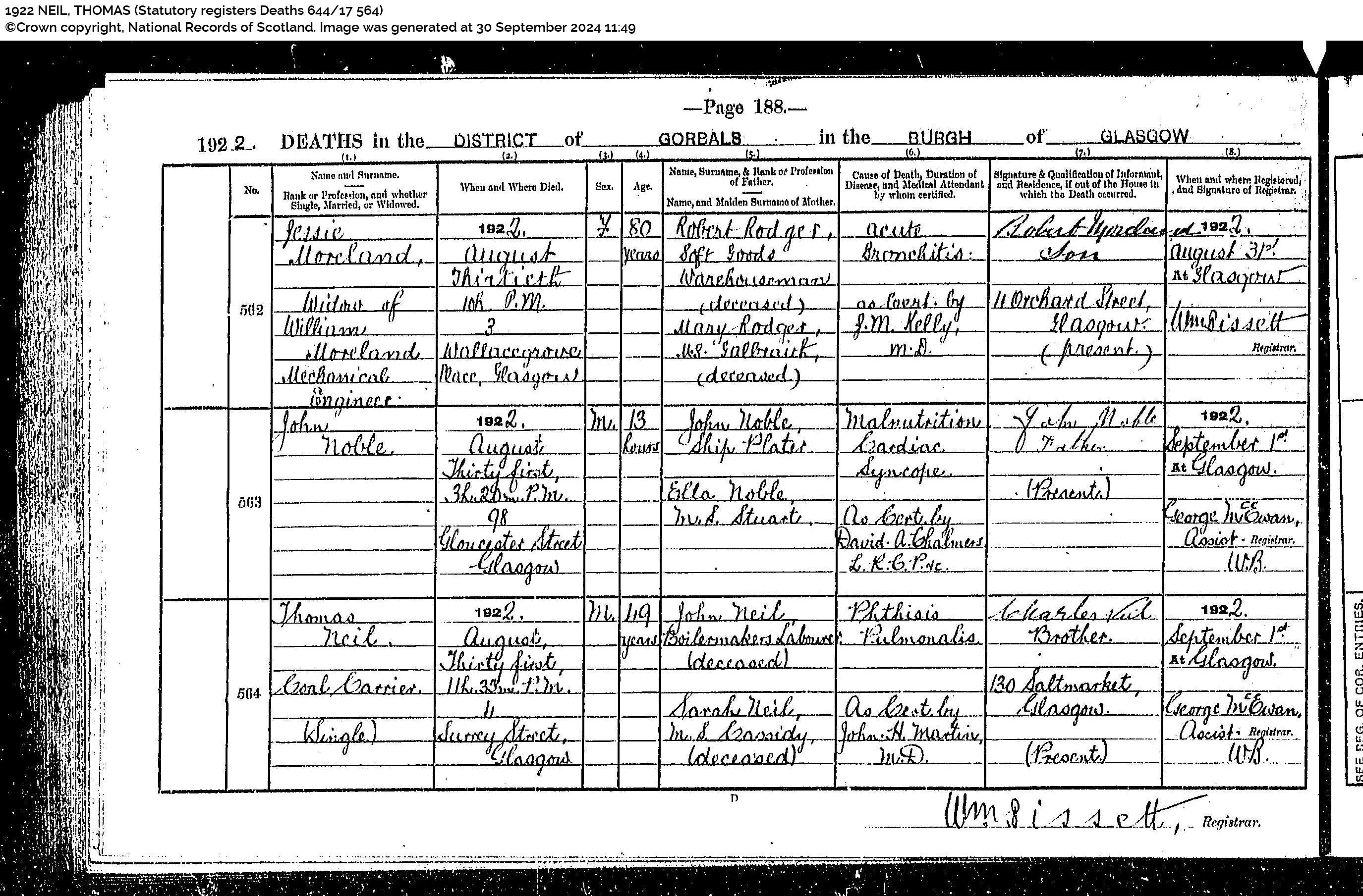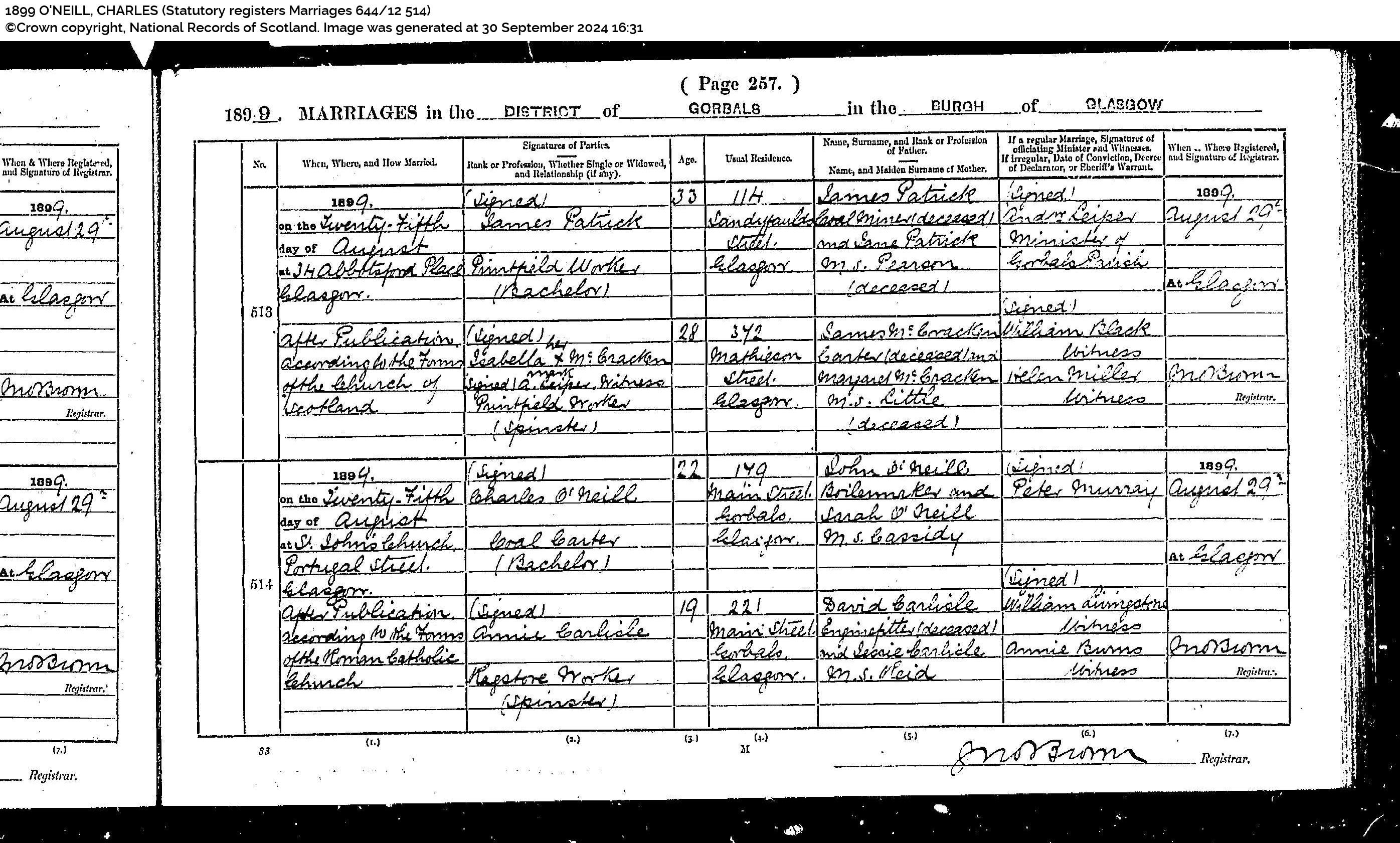 Charles O'Hara Son 17y 6m M S Glasgow, Lanarkshire Dye Worker Higginbottom, Beashfield
