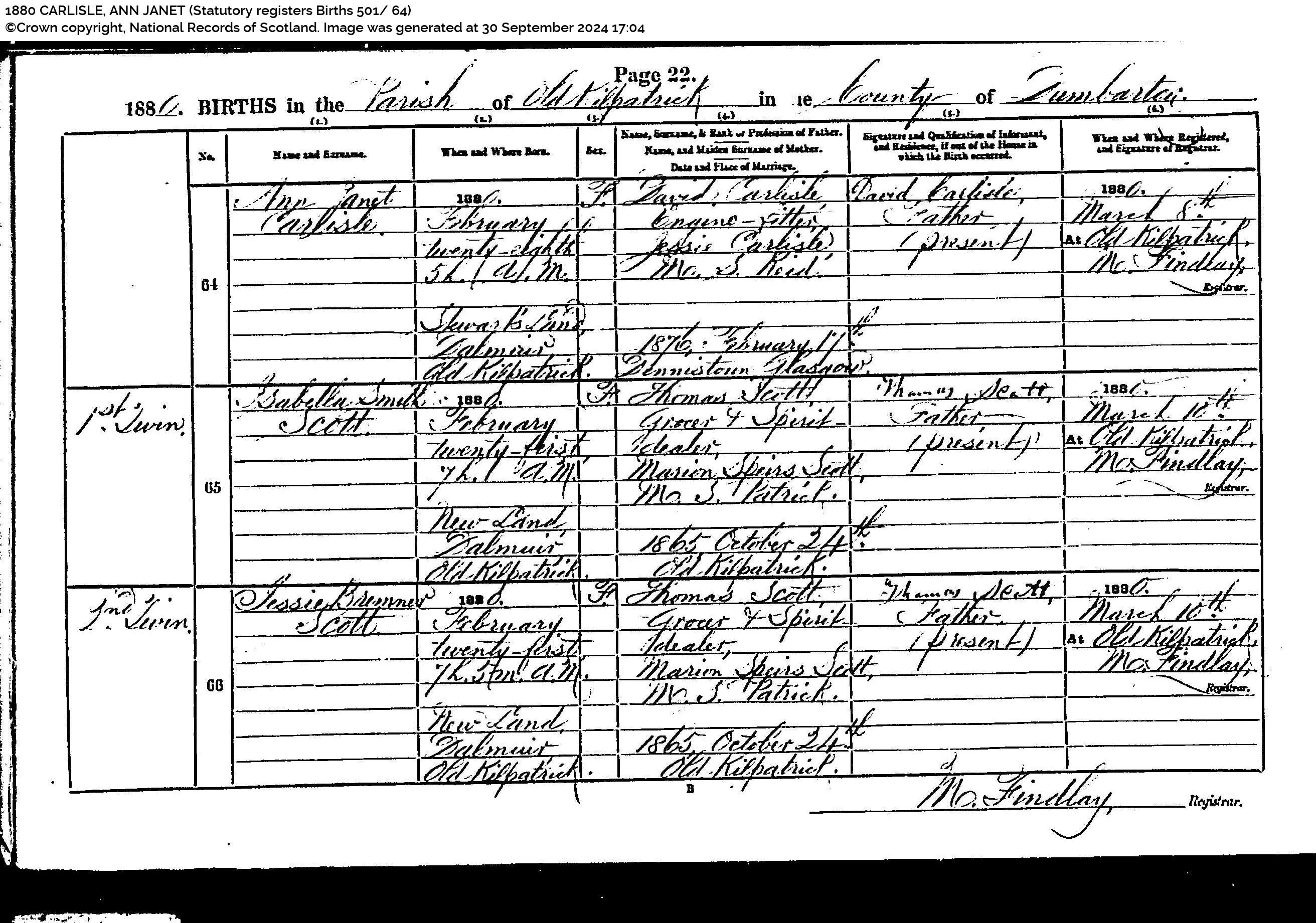 “Ann Arneil (born) 3rd April 1865 at 135 Main Street, Glasgow. (daughter of) John Arneil, Foundry Labourer and Sarah Arneil ms Cassidy (who were married) 15 October 1860 in Glasgow. Informant Sarah Arneil signed her (x) with mark, Mother. Garm Thomson, (Assistant Registrar) Registered 11 April 1865 at Glasgow.