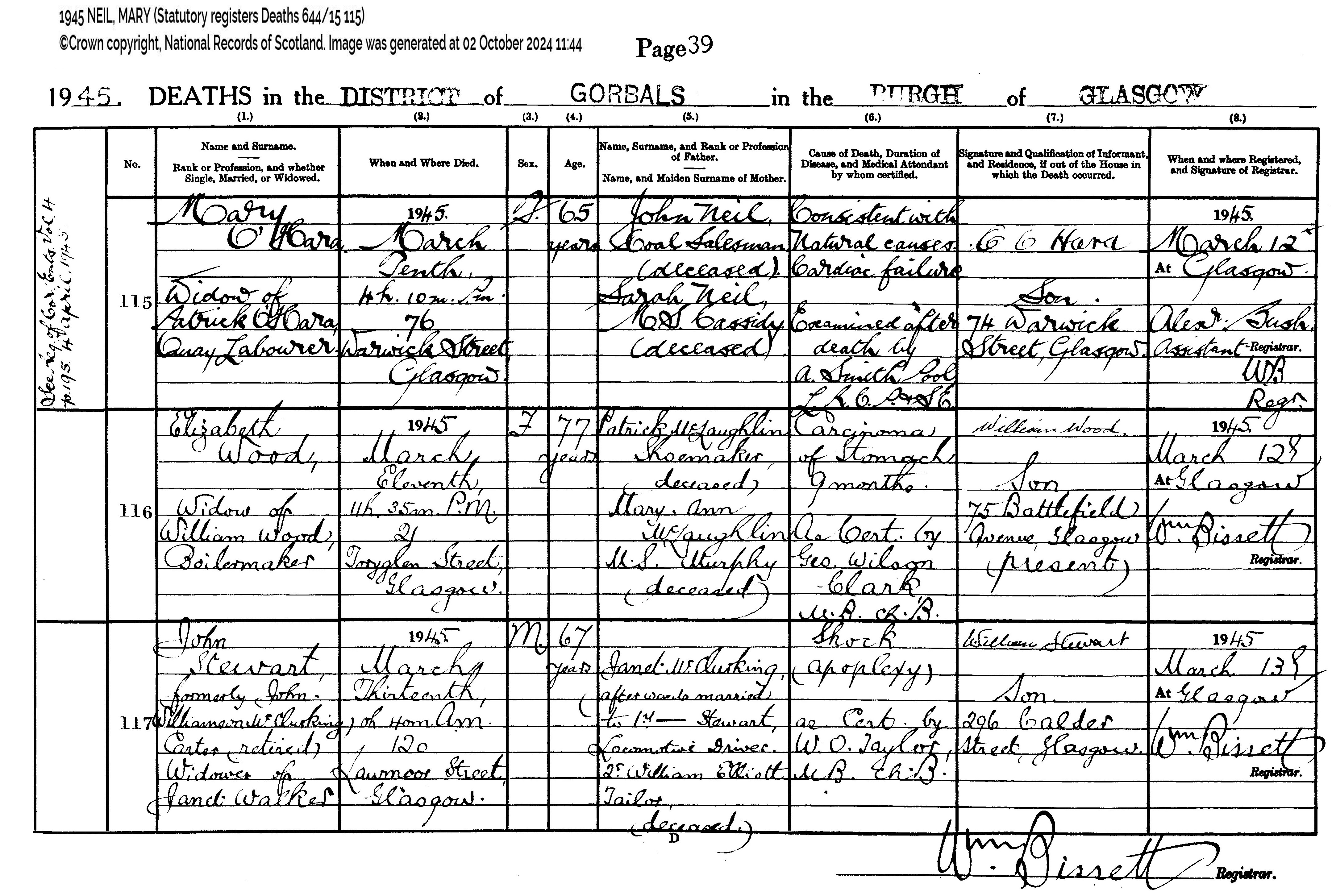 Mary O’Hara, Widow of Patrick O’Hara, Quay Labourer (died) 10 March 1945 (at) 4h 10m PM (at) 76 Warwick Street, Glasgow (aged) 65 years (daughter of) John Neil, Coal Salesman (deceased) and Sarah Neil M.S. Cassidy. (cause of death) Consistent with Natural causes, Cardiac Failure. Examined after death by A Smith Poot LRCP &SE (Informant C O’Hara, Son (usual residence) 74 Warwick Street, Glasgow. (Registered 12 Mar 1945 at Glasgow (Asst Registrar) Alexr Bush