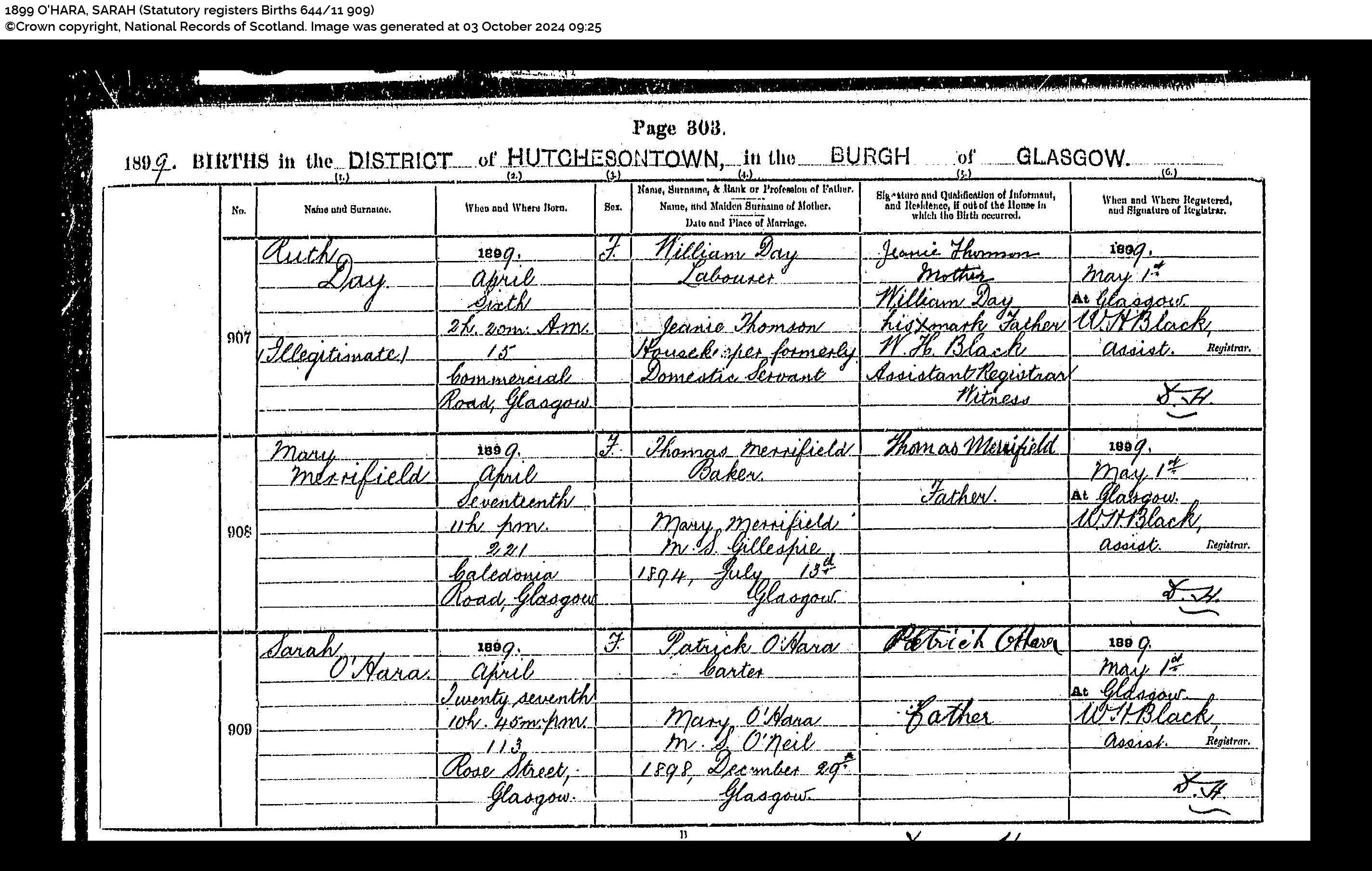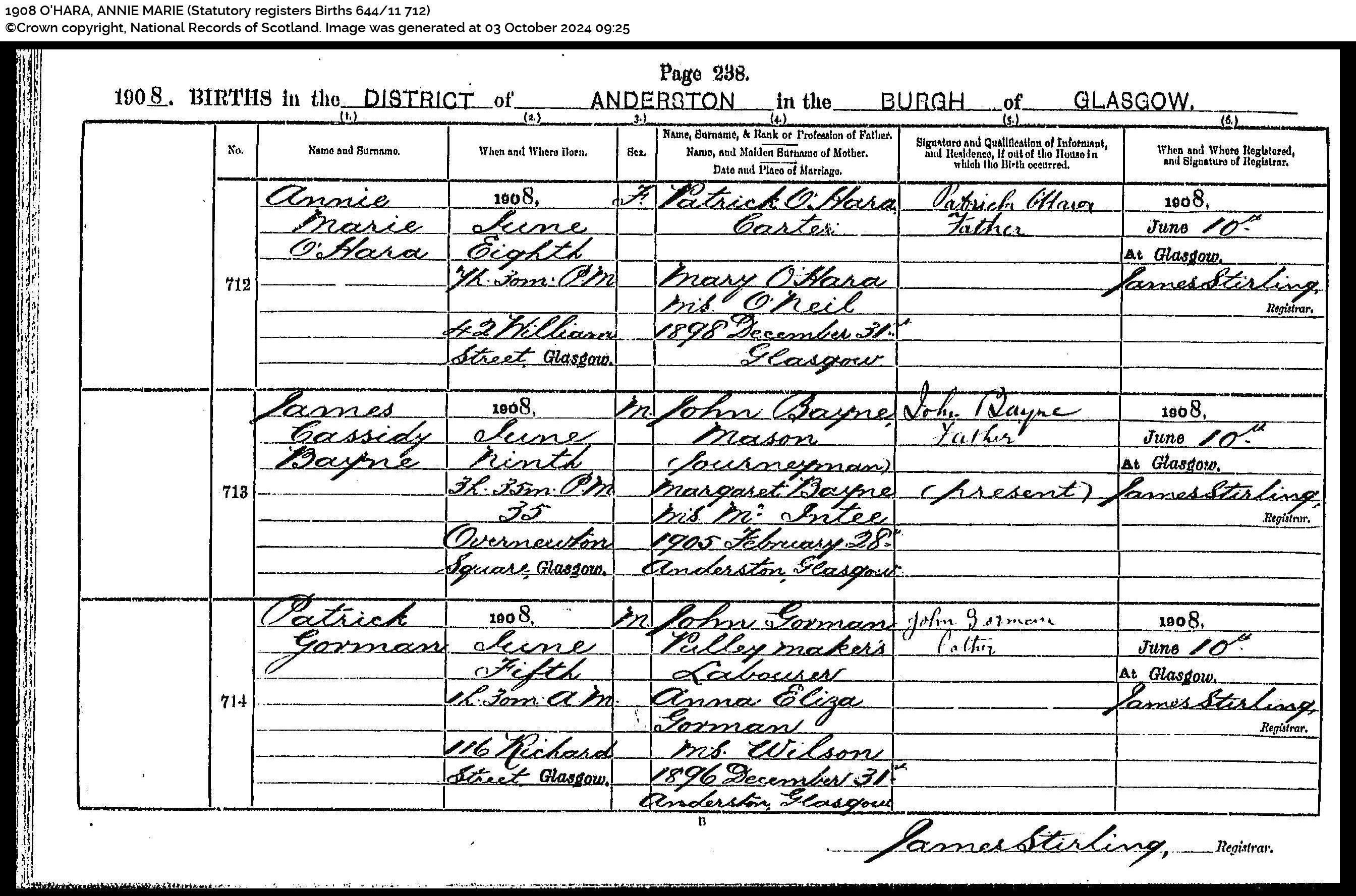 Annie Marie O’Hara (born) 8 Jun 1908 (at) 7h 30m pm (at) 42 William Street, Glasgow (daughter of) Patrick O’Hara, Carter (and) Mary O’Hara M.S. O’Neil (married 31 December 1898 Glasgow) (Informant) Patrick O’Hara, father. (Registered) 10 Jun 1908 at Glasgow (Registrar) James Stirling”