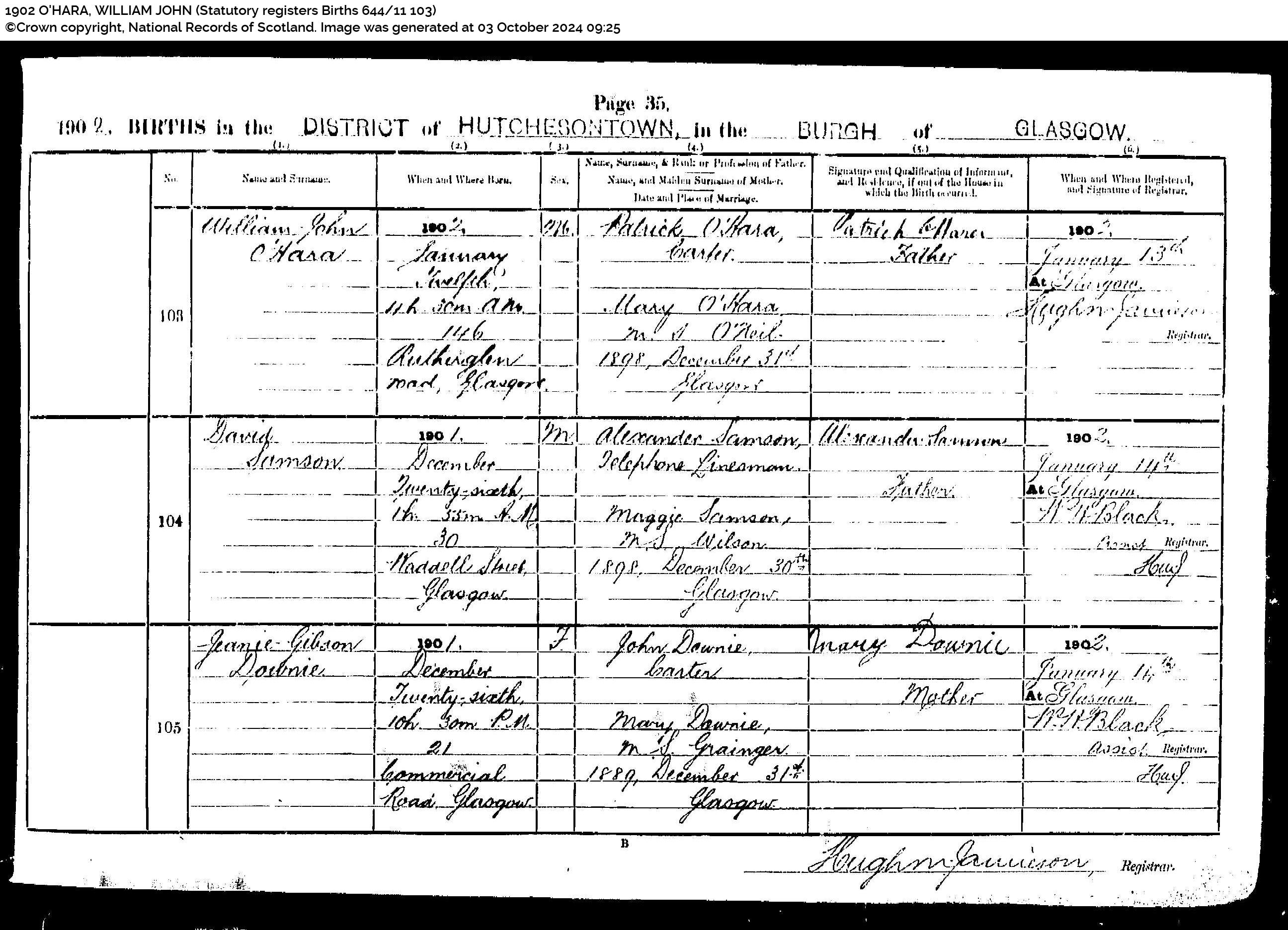 Birth of William John O’Hara b 12 Jan 1902, Scotland’s People, (Scottish Statutory registers Births 644/11 103 Page 35 No 103)