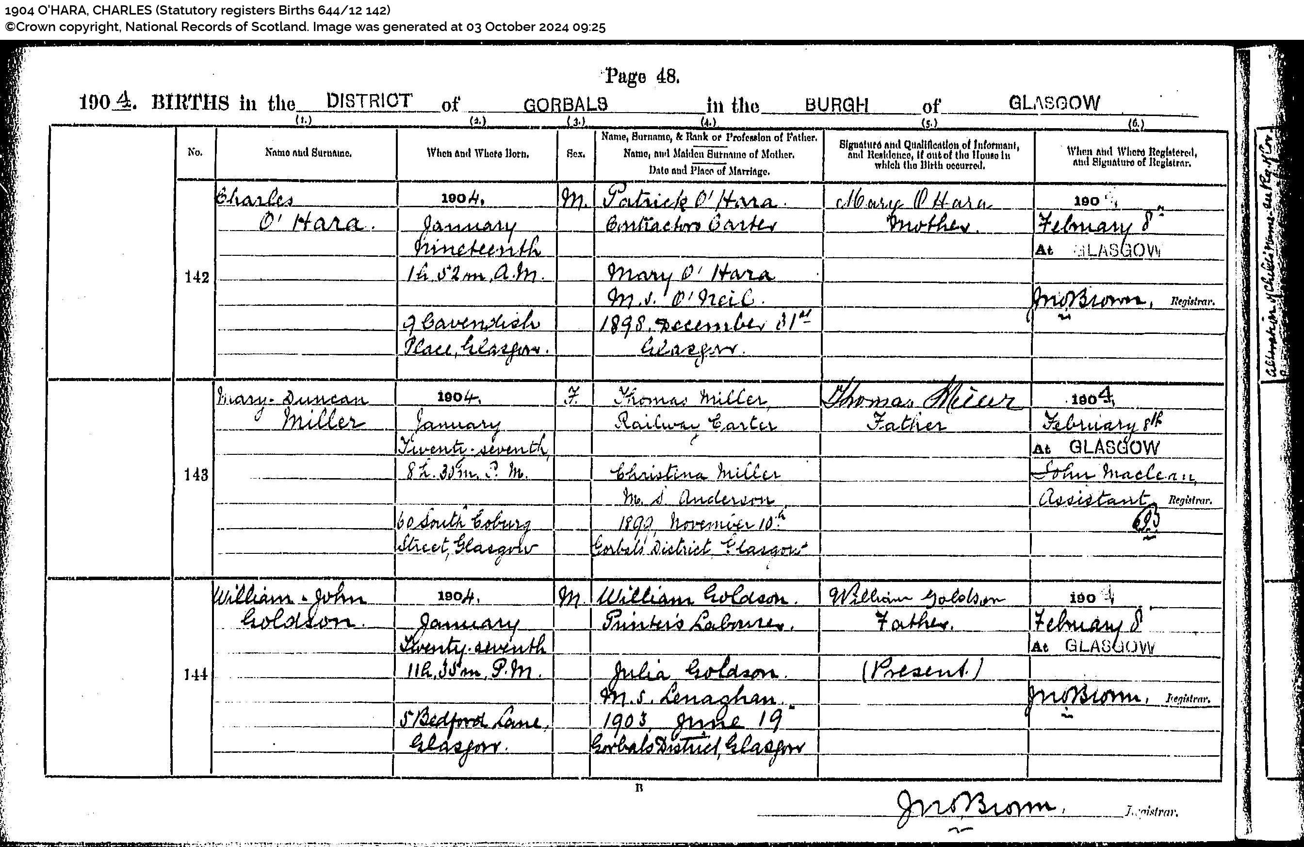 Birth of Charles O’Hara b 19 Jan 1904, Scotland’s People, (Scottish Statutory registers Births 644/12 142 Page 48 No 142)
