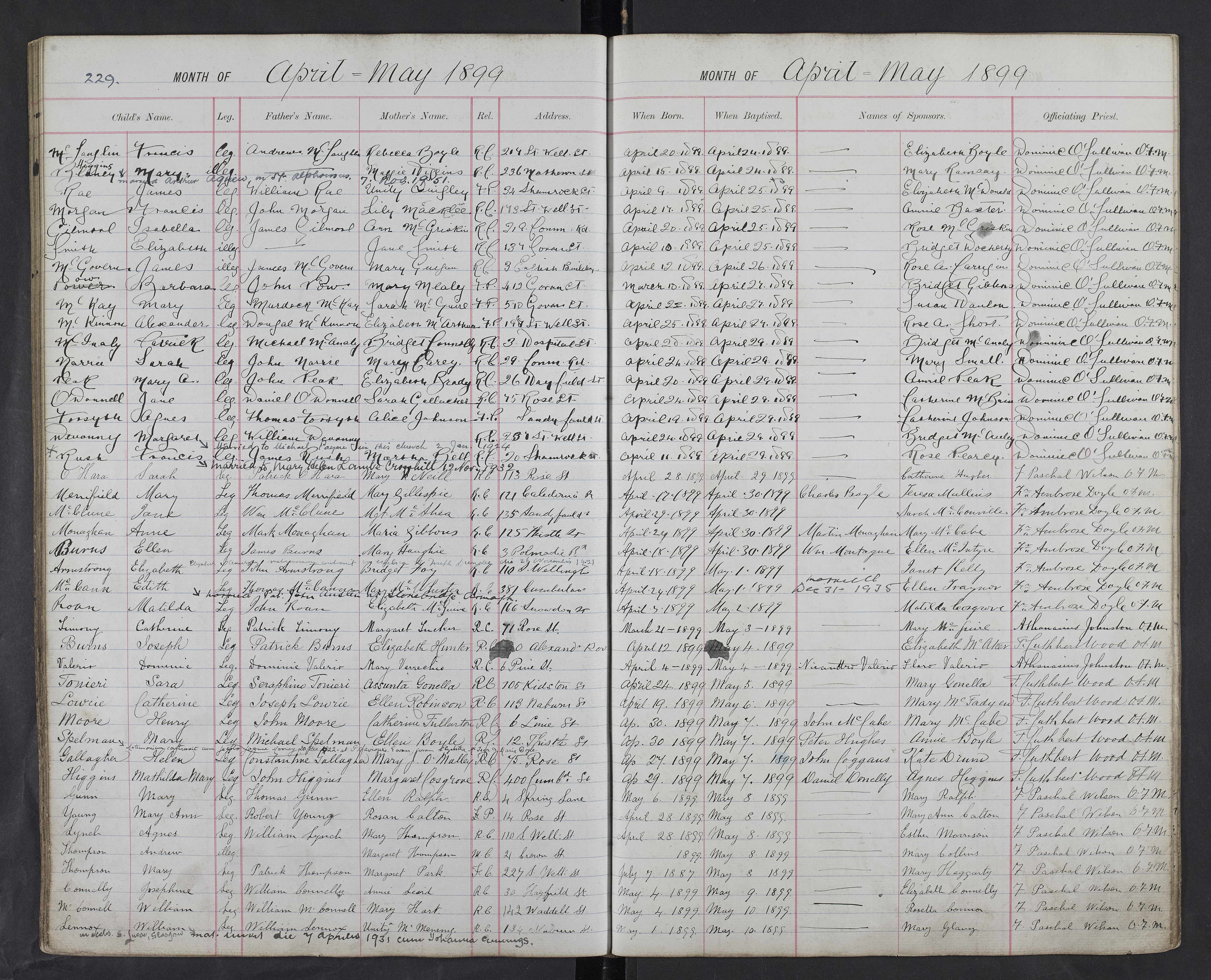 Sarah O’Hara Leg (daughter of) Patrick O’Hara (and) Mary O’Neil (rel) RC (Address) 17 Thistle Street (Born) 24 April 1913 (Baptised) 9 May 1913 (Sponsor) Sarah O’Neil (Officiating Priest) Joseph Doherty”