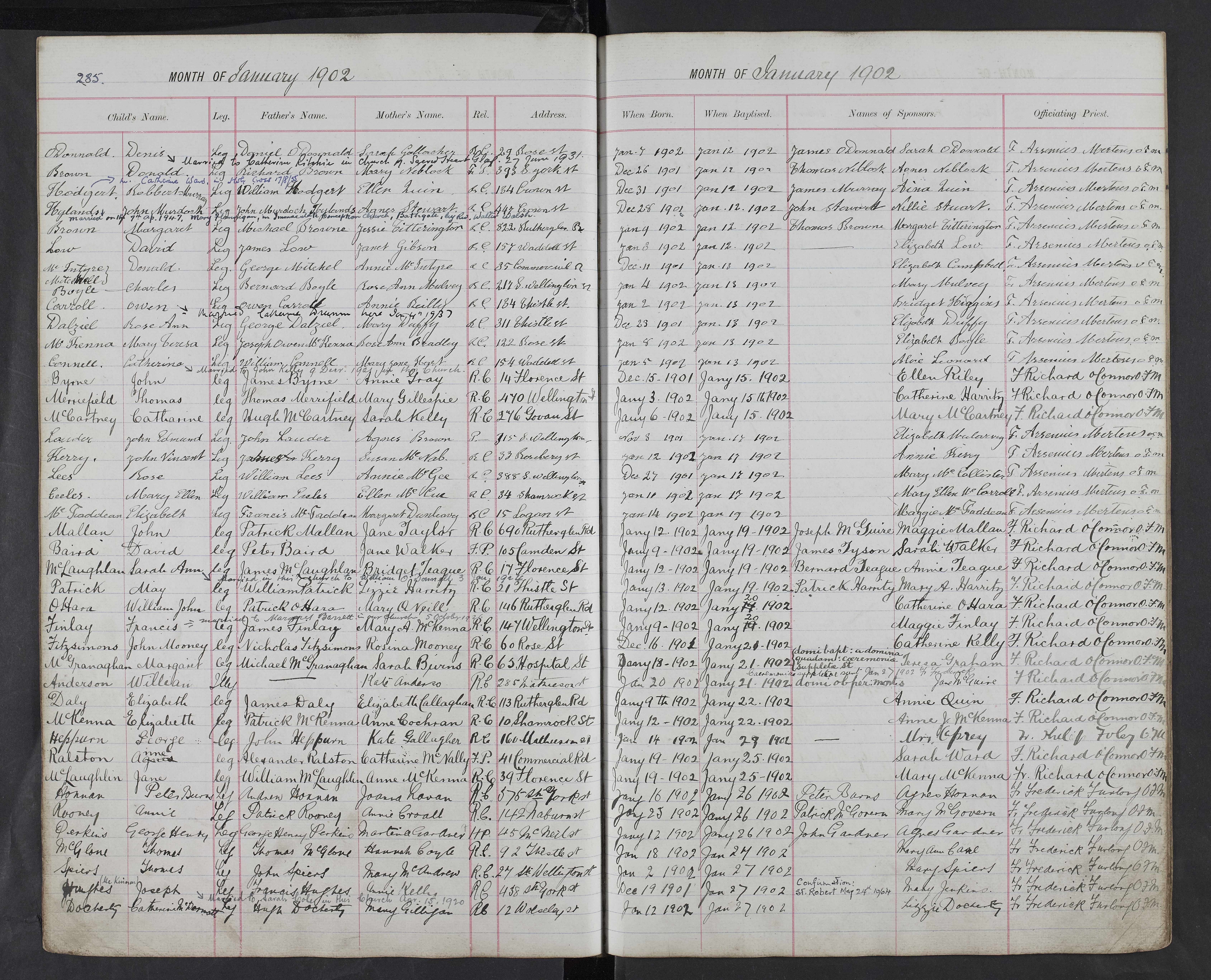 “St Francis, Glasgow, Gorbals, Lanarkshire, Scotland Baptismal Registers January 1902 Page 285