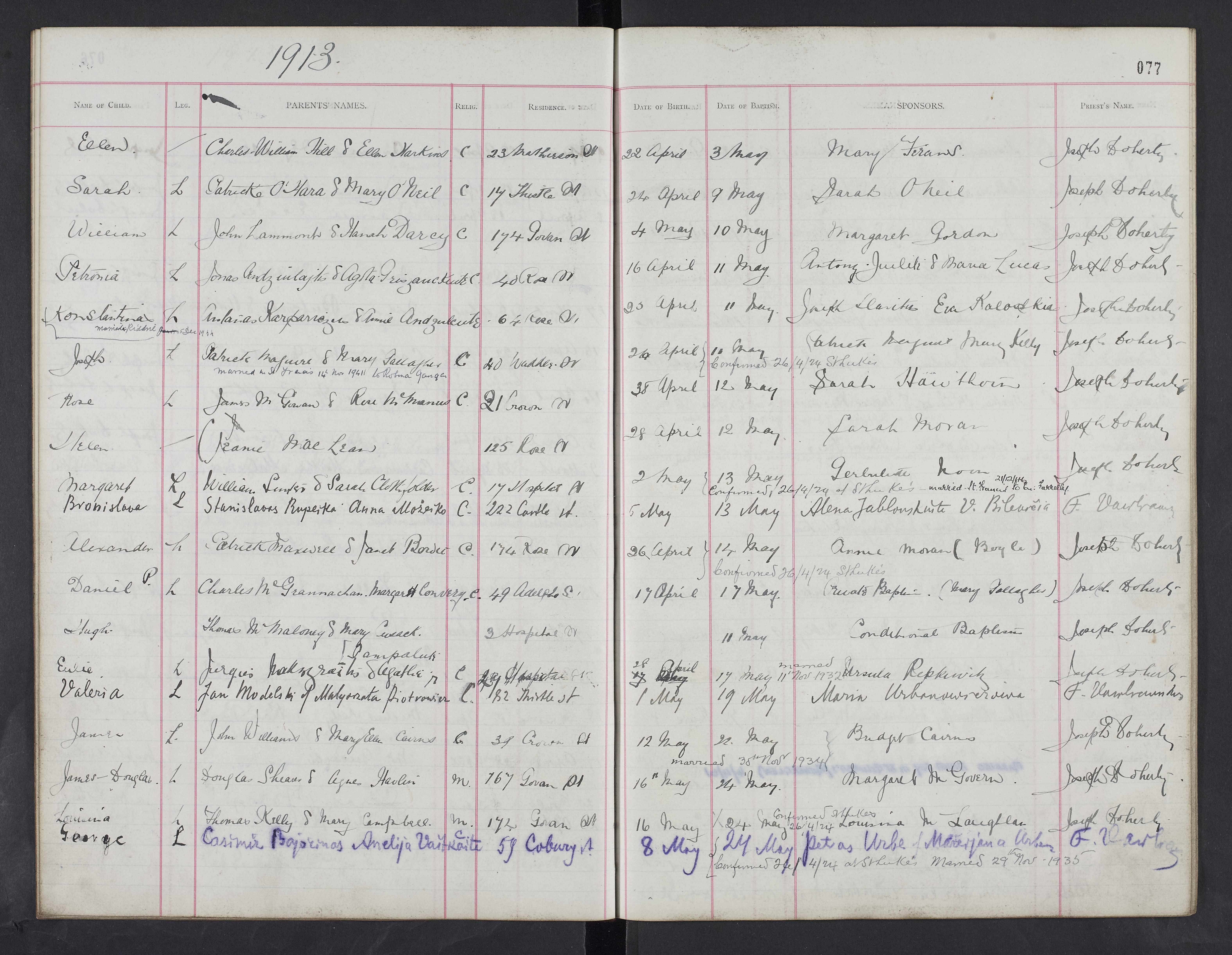 “St Luke’s, Glasgow, Gorbals, Lanarkshire, Scotland Baptismal Registers 1913 Page 077