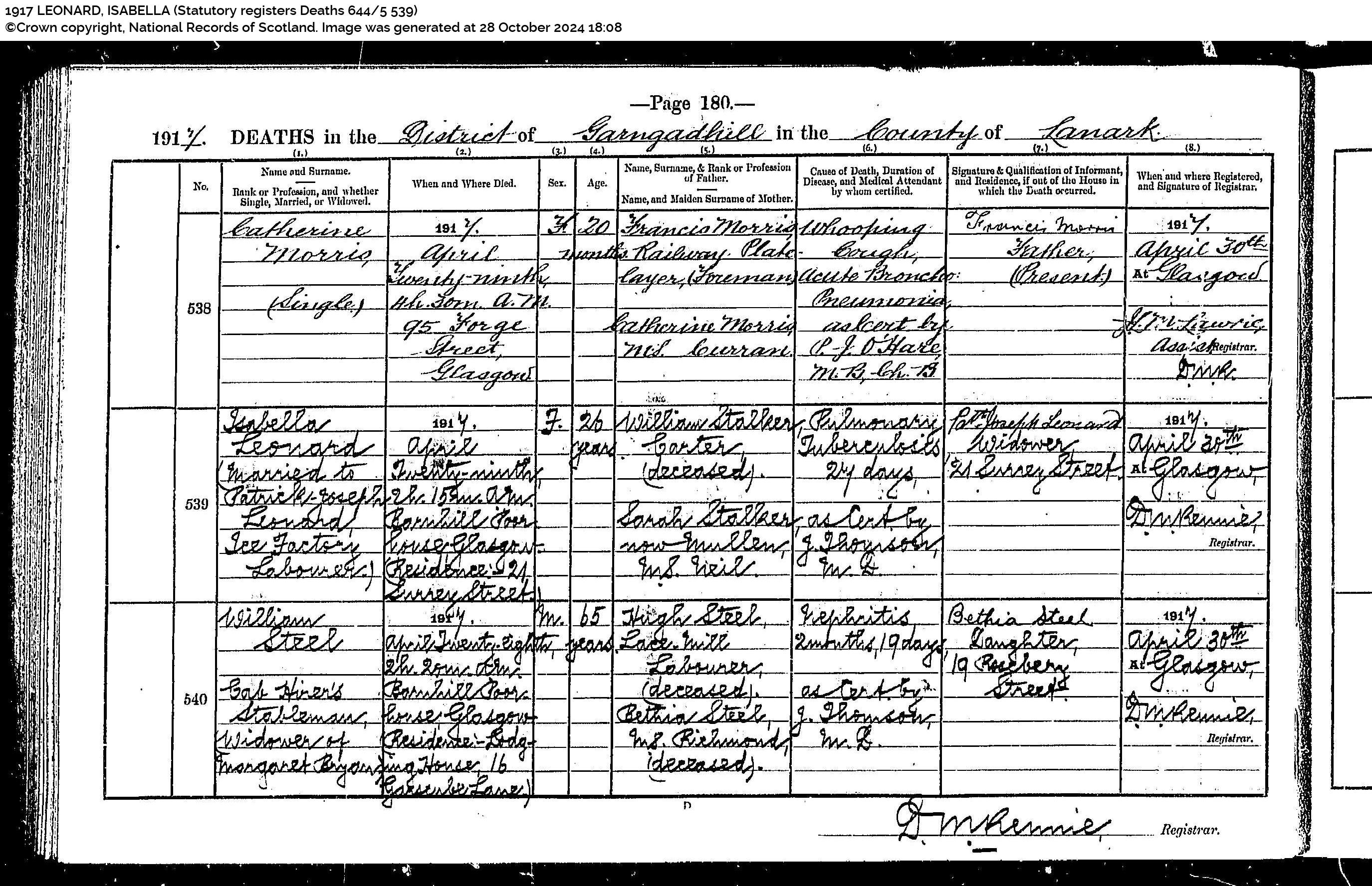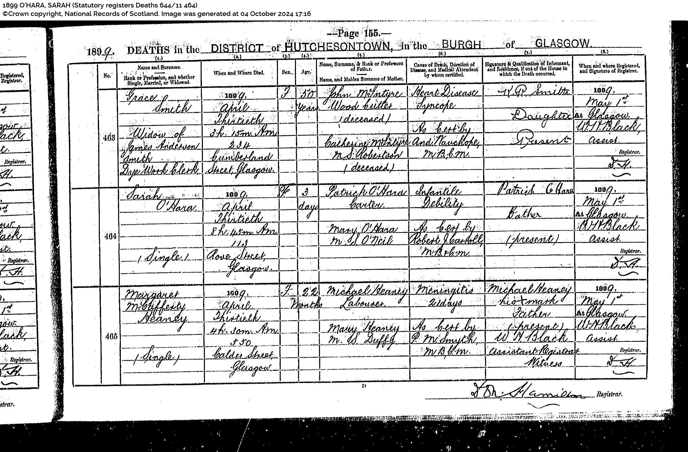 Sarah O’Hara (Single) (died) 8 Jun 1916 (at) 7h 45m P.M. (at) 38 Nelson Street, Glasgow (sex) F (Age) 3 (daughter of) Patrick O’Hara, Quay Labourer and Mary O’Hara M.S. O’Neil (cause od death) Rickets 1 year 1 month, Bronchio Pneumonia 10 days (as cert by) A. A. F. Steen MB BM (informant) Patrick O’Hara, Father (Registered) 9 Jun 1916 at Glasgow (Registrar) Jno Brown”
