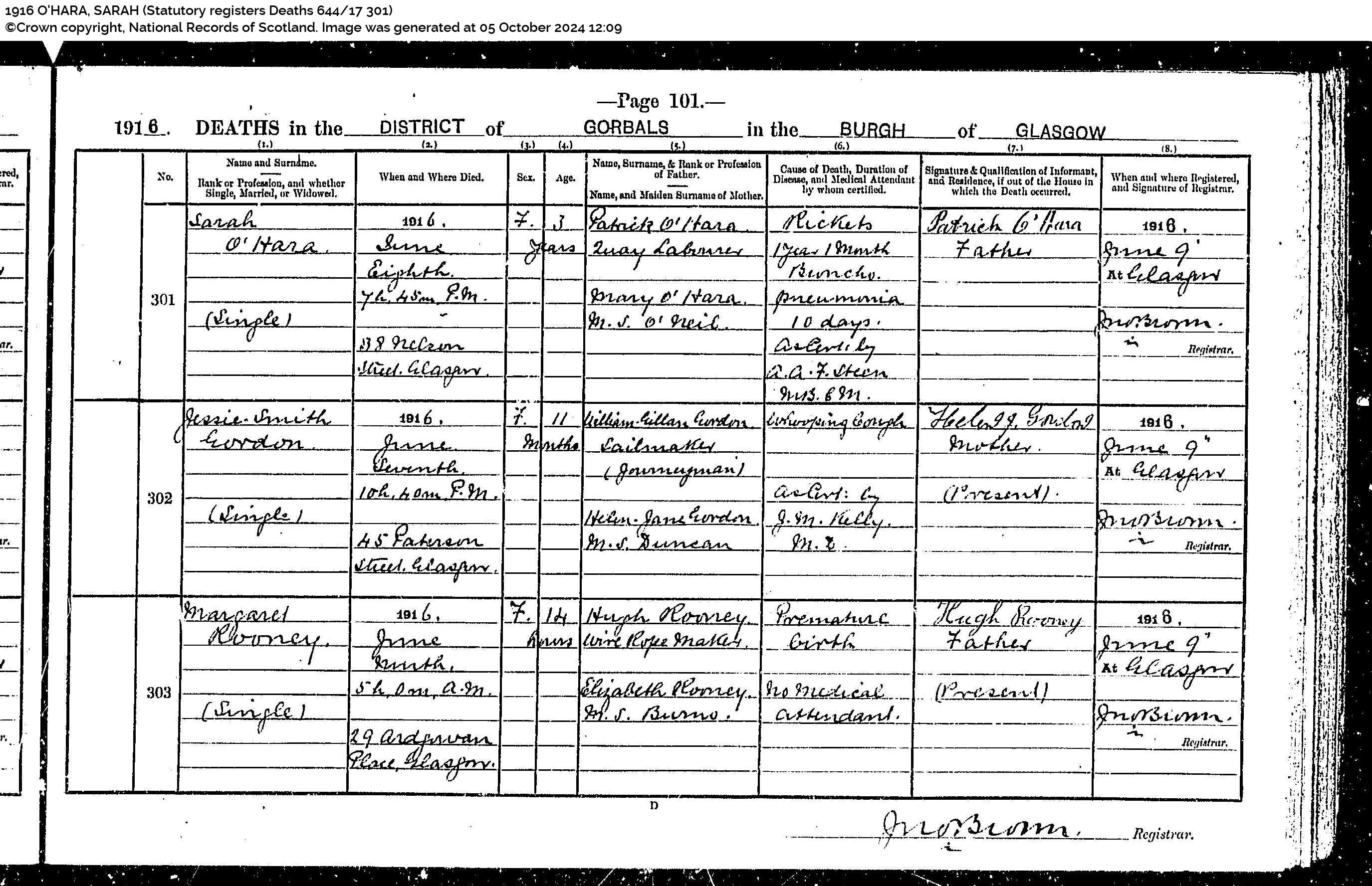 Death of Sarah O’Hara 8 Jun 1916, Scotland’s People, (Scottish Statutory registers Deaths644/17 301 Page 101 No 301)