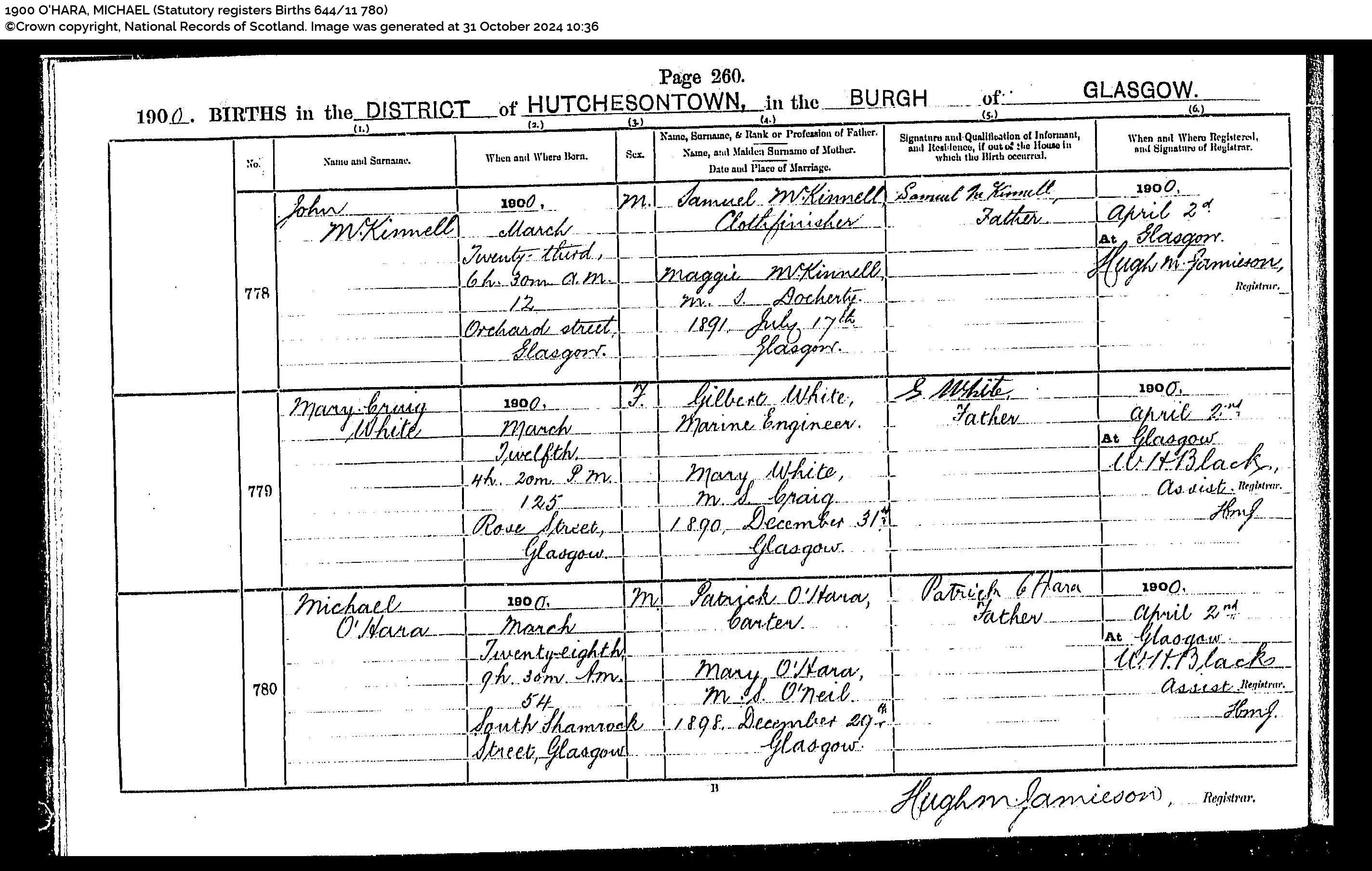 Birth of Charles O’Hara b 19 Jan 1904 at 1902 at 9 Cavendish Place, Gorbals, Glasgow