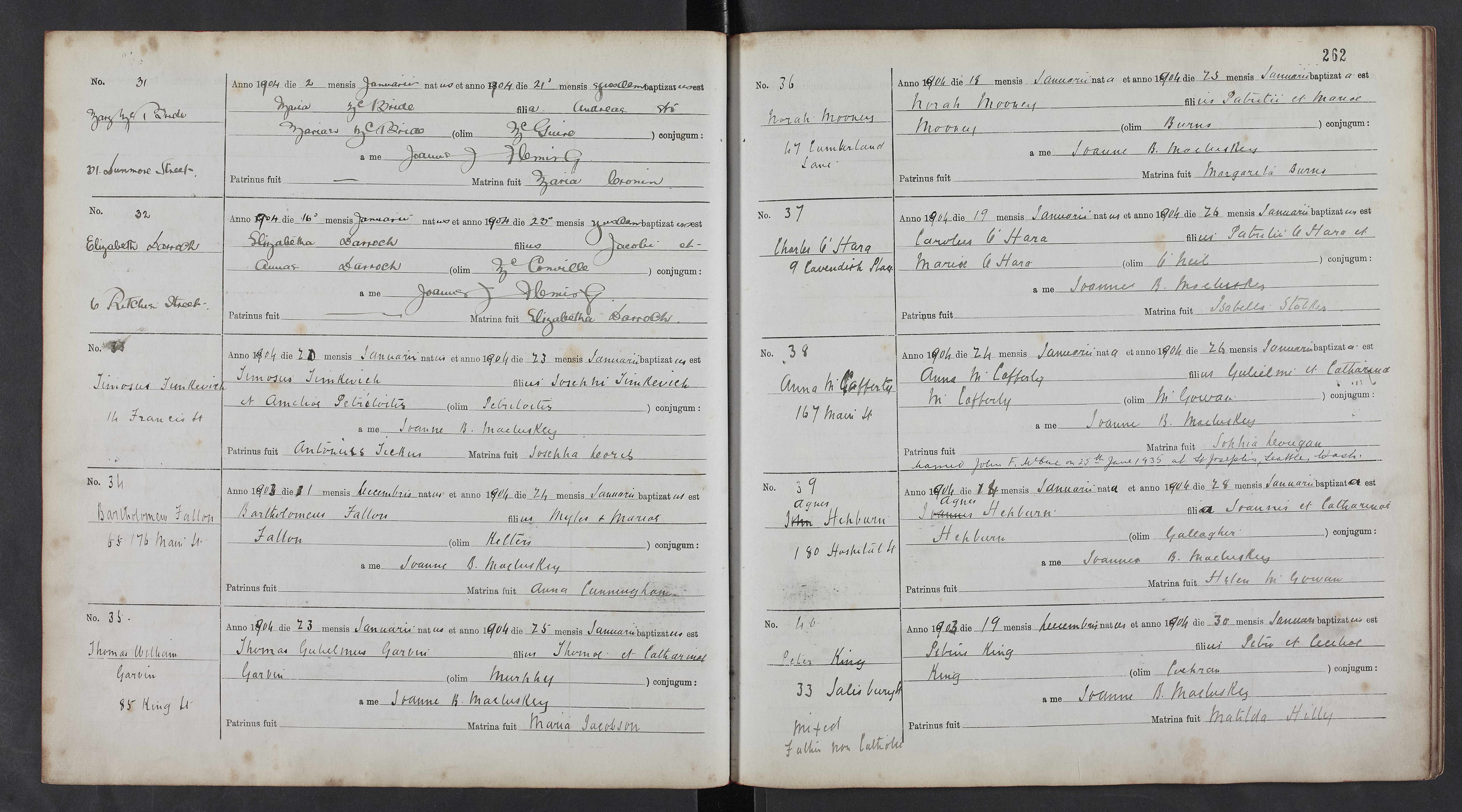 Charles O’Hara [address] 9 Cavendish Place [son of Patrick O’Hara [and] Mary O’Hara ms O’Neil [born] 19 Jan 1904 [baptised] 26 Jan 1904 [by me] Joannes B McCluskey [ godmother] Isabella Stalker”