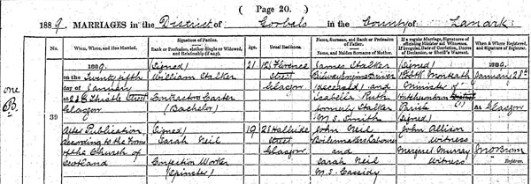 Marriage of Elizabeth Neil and John Carruthers 8 Apr 1885 at St John’s Chapel, Portugal Street, Glasgow