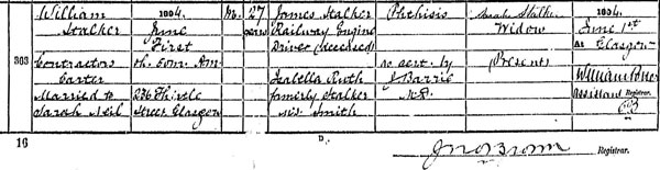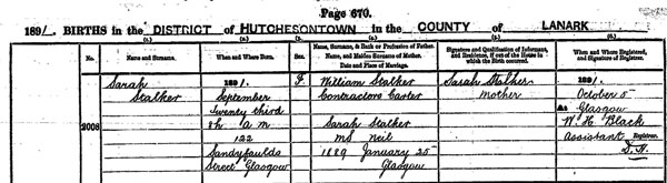 Lizzie’s sister, Sarah, had married William Stalker on 25 Jan 1889 and at the 1891 Census was living with her husband and therir 11 month old daughter, Isabella, at 100 Florence Street, Gorbals.