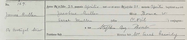 27 Nov 1893 at St John the Evangelist, Portugal Street, Glasgow. Mary Lawf. child of John Carruthers and Elizabeth O’Neil Born the 22nd day of November 1893 was Baptized by me on this 27th day of November 1893. Sponsors Mary Oneil and — Minister P. W. Ryan