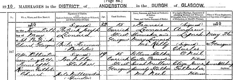 “On the 8th day of April 1885 at St John’s Chapel, Portugal Street, Glasgow she married John Carruthers according to the forms of the Roman Catholic Church. John Carruthers, 20 years old, bachelor, an Iron Moulder signed his (x) mark witnessed John B. McLuskey. (his usual address was) 3 Cavendish Place, Glasgow (and he was the son of) John Carruthers (Deceased), Seaman / Mechanical Service and Jane Carruthers, M.S. Boyd (Deceased). Lizzie Neil, 18-years-old, a spinster, (usual residence) 4 Surrey Street, Glasgow and a Calender Worker (was the daughter of) John Neil, Boilermaker’s Labourer and Sarah Neil, M.S. Cassidy. Witnesses James McQueen and Mary Blake. Registered 8th April 1885 at Glasgow.