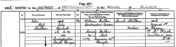 John Carruthers (born) 5 November 1897 (at) 3h 30m AM (at) 4 Surrey Street, Glasgow. (son of (John Carruthers, Ironmoulder Journeyman and Lizzie Carruthers MS Neil (married) 1885 April 8 Gorbals District, Glasgow. (Informant) John Carruthers, Father his (x) mark. (Witness) Jno Brown (Registered) 8 November 1897 at Glasgow (Registrar) Jno Brown