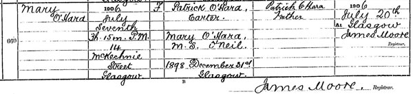 Mary O’Hara (born) 7 July 1906 (at) 3h 15m pm (at) 114 McKechnie Street, Glasgow (daughter of) Patrick O’Hara, Carter (and) Mary O’Hara M.S. O’Neil (married 31 December 1898 Glasgow) (Informant) Patrick O’Hara, father. (Registered) 20 July 1906 at Glasgow (Registrar) James Moore”