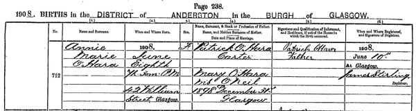 Birth of Annie Marie O’Hara b 8 Jun 1908 at 2 William Street, Anderton, Glasgow
