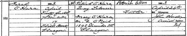 Sarah O’Hara (born) 24 Apr 1913 (at) 7 30m am (at) 13 Thistle Street, Glasgow (daughter of) Patrick O’Hara, Quay Labourer (and) Mary O’Hara M.S. O’Neil (married 31 December 1898 Glasgow) (Informant) Patrick O’Hara, father. (Registered) 24 Apr 1913 at Glasgow (Registrar) John Houston”