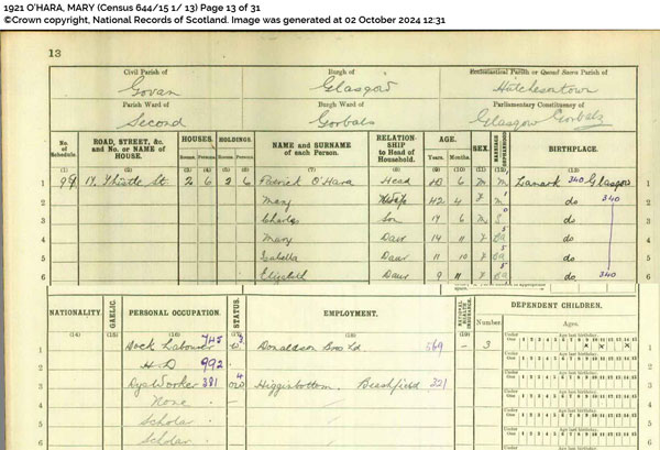 Mary O’ Hara or O’Neil at the 1921 Census – 17 Thistle Street, Hutchesontown, Glasgow