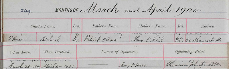William John O’Hara Leg (son of) Patrick O’Hara (and) Mary O’Neill (rel) RC (Address) 1146 Rutherglen Road (Born) 12 Jan 1902 (Baptised) 20 Jan 1902 (Witness) Catherine O’Hara (Officiating Priest) F Richard O’Connor”