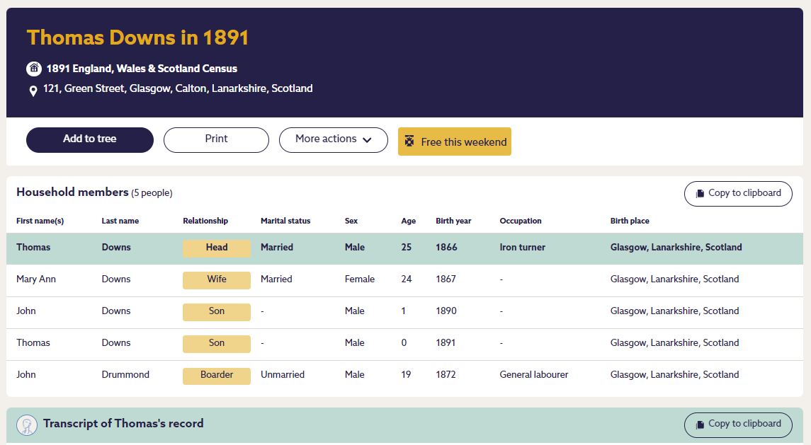 Thomas and Ann Downs at the 1891 Census – 121 Green Street, Calton, Glasgow