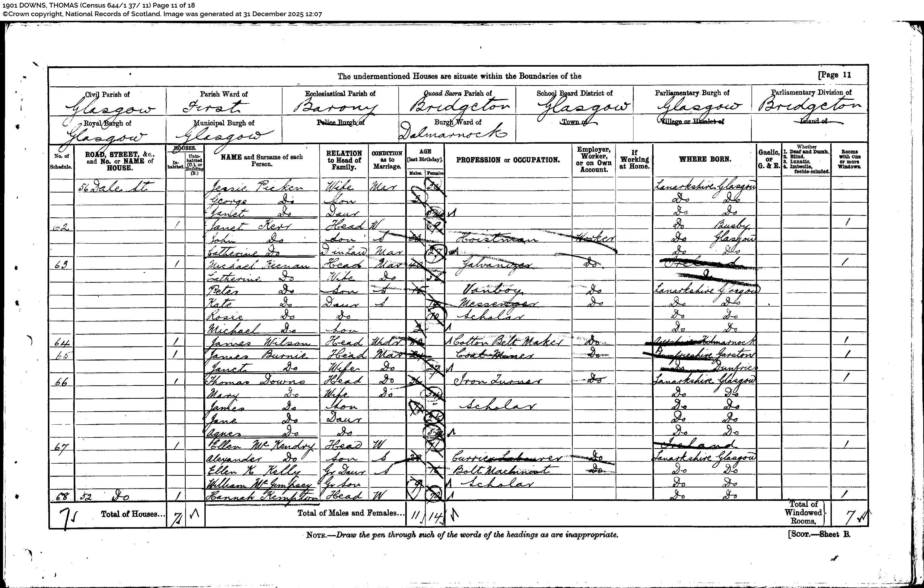 1901 Census Return for 56 Dale Street, Bridgeton, Glasgow. Scotland’s People: 1901 DOWNS, THOMAS (Census 644/137/ 11) Page 11 of 18)