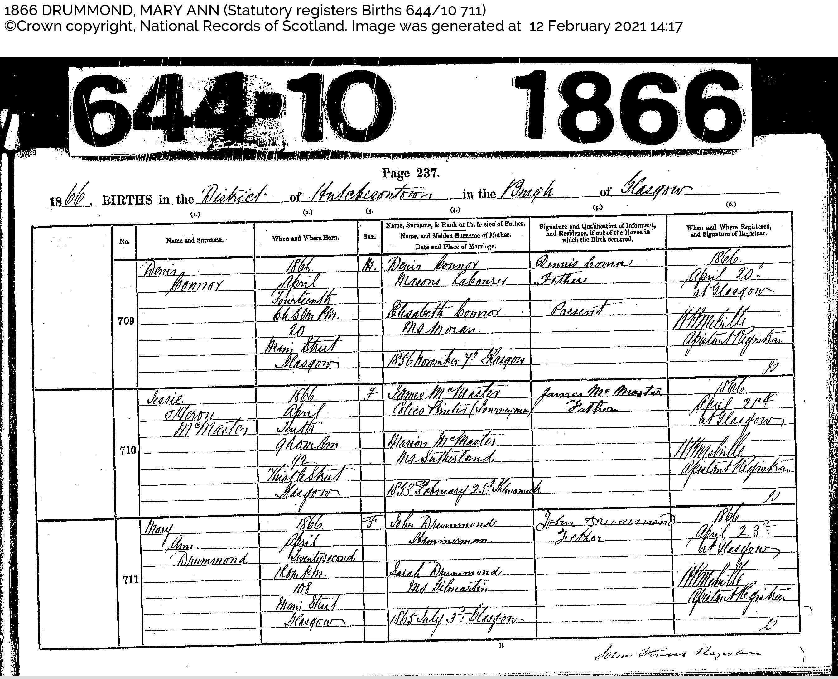 Birth of Mary Ann Drummond 22 Apr 1866, Scotland’s People 1866 DRUMMOND, MARY ANN (Statutory registers Births 644/10 711) Page 237 Item 711