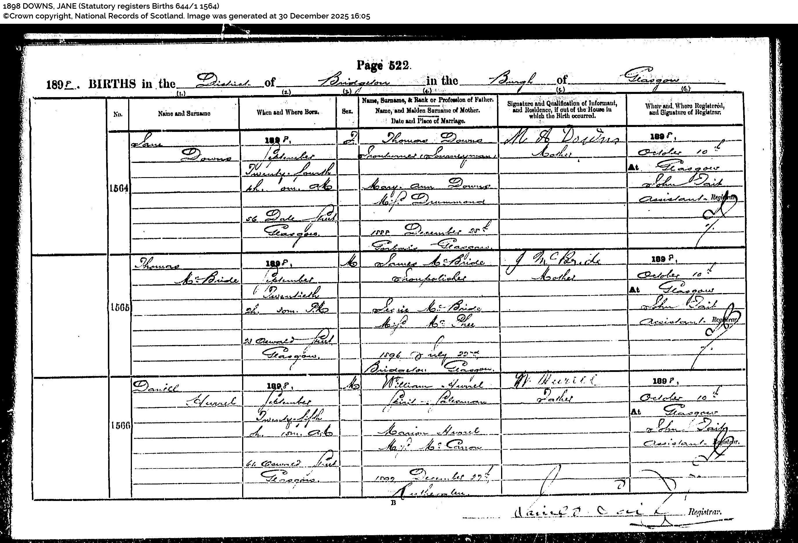 Birth of Jane Downs 24 Sep 1898 at S56 Dale Street, Bridgeton, Glasgow. Scotland’s People – Scottish Statutory register Births: 1898 DOWNS, JANE (Statutory registers Births 644/1 1564) Page 552 Item 1564