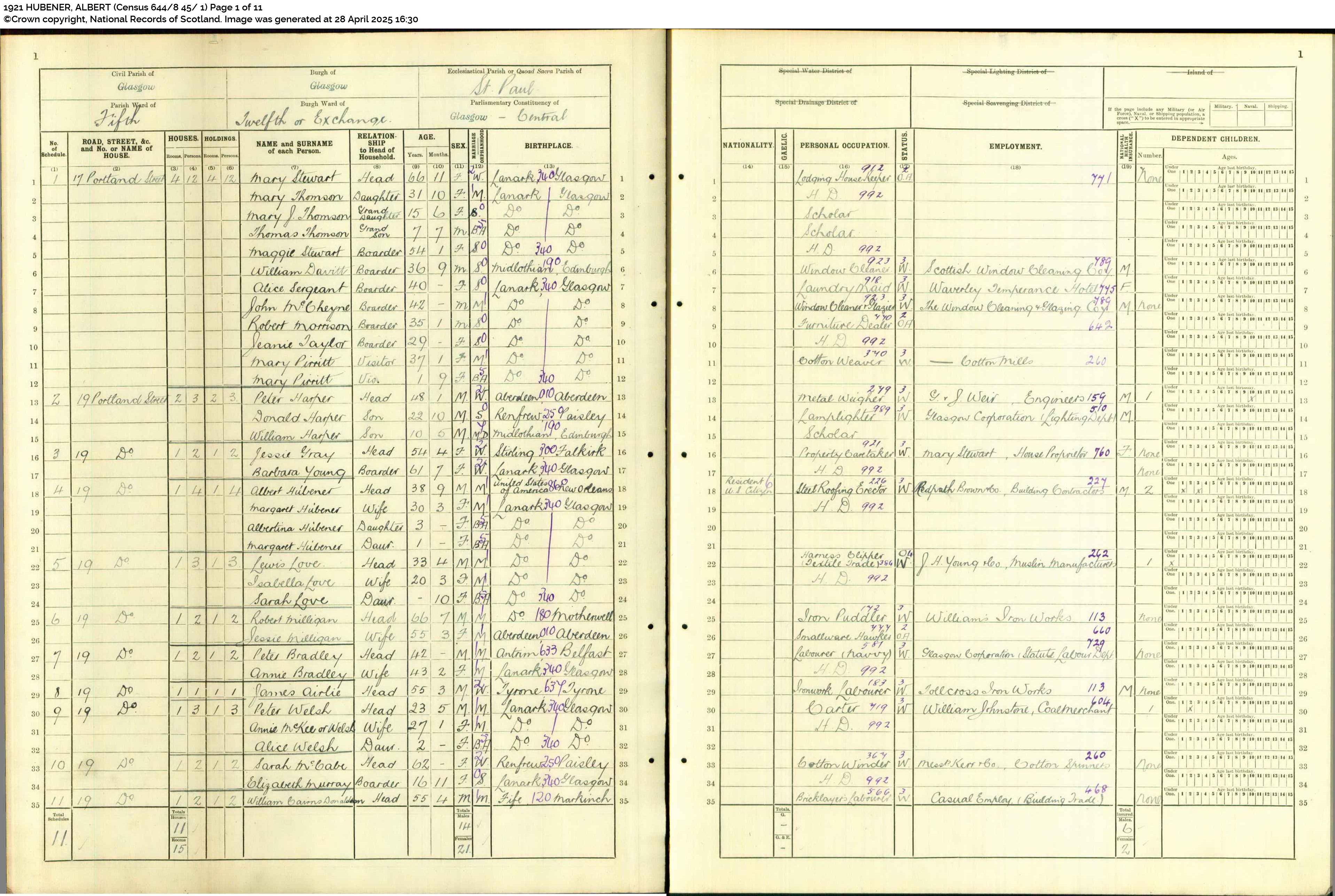 1921 Census Return for 19 Portland Street, St Rollox, Glasgow (Scotland’s People 1921 Census England, Wales & Scotland Census: 1921 HUBENER, ALBERT (Census 644/8 45/ 1) Page 1 of 11