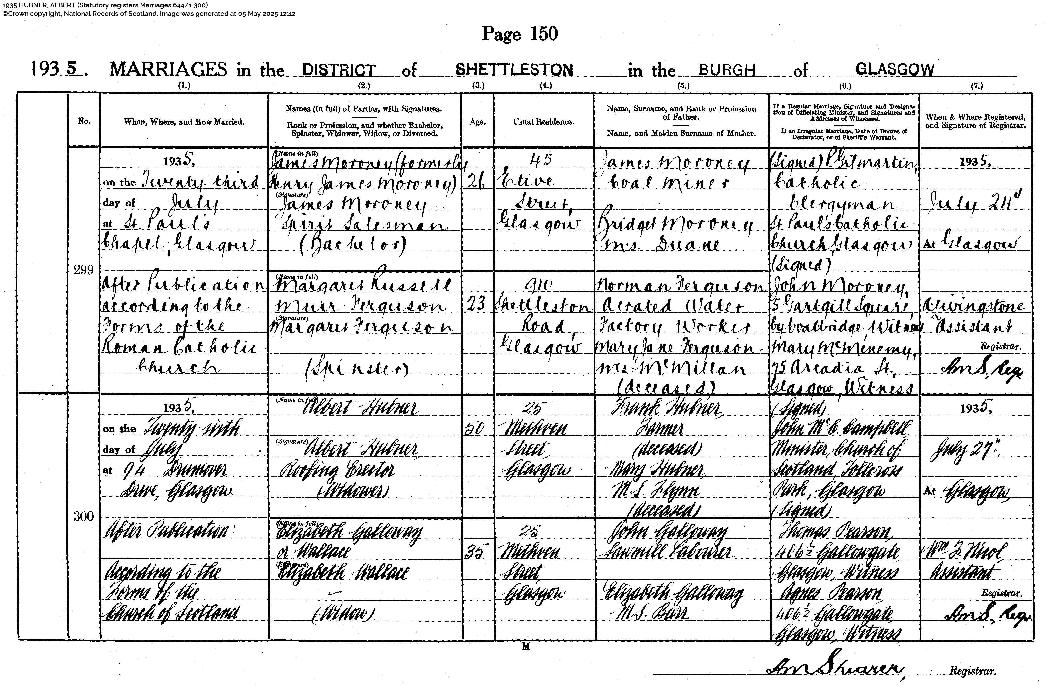 Marriage of Albert Hubner and Elizabeth Galloway 26 July 1935. Scotland’s People, Scottish Statutory Marriage Registers Ref 1935 HUBNER, ALBERT (Statutory registers Marriages 644/1 300) Page 150 Item 300