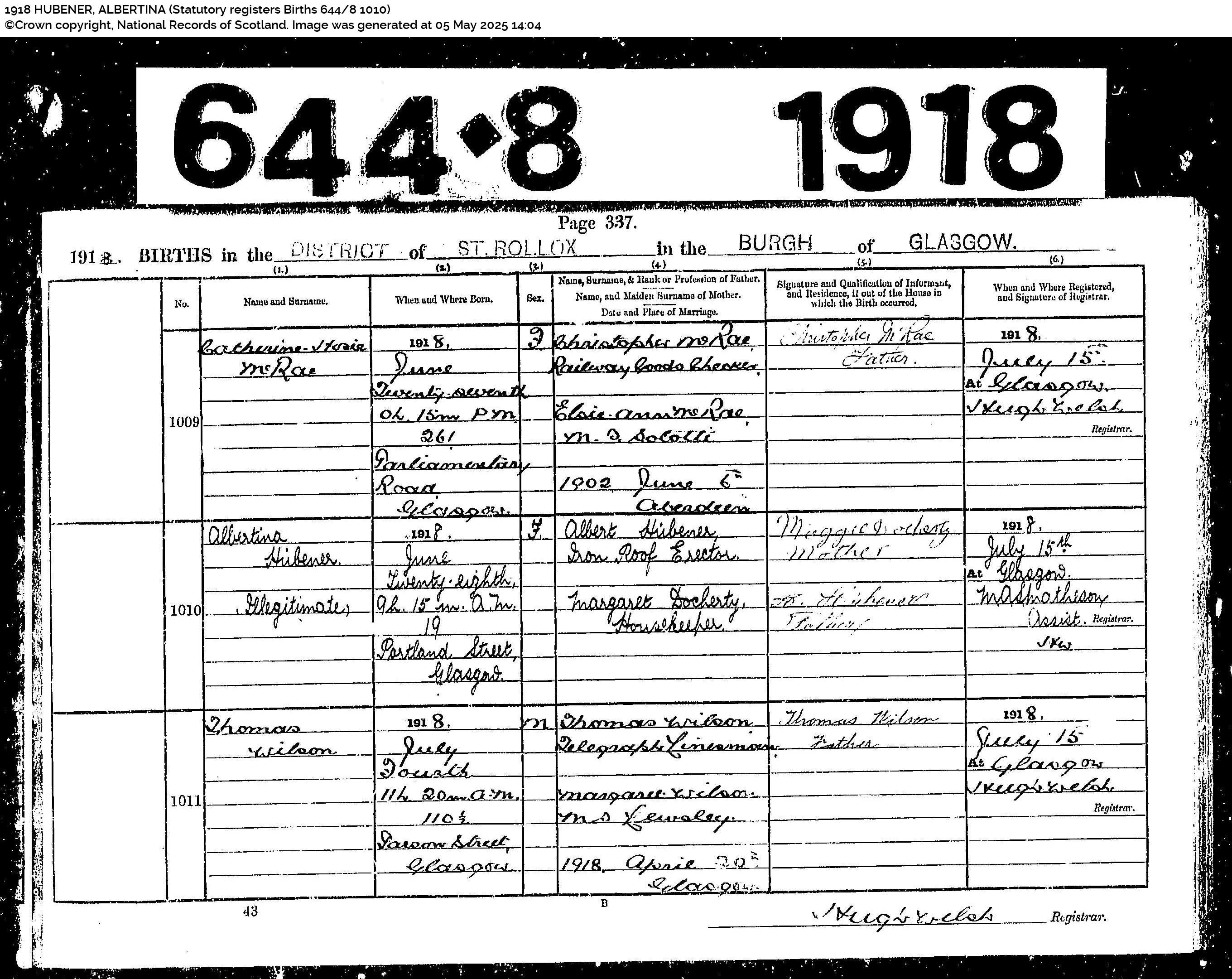 Birth of Albertina Hubener 28 June 1918. Scotland’s People. Scotland Statutory Marriage Registers 1918 HUBENER, ALBERTINA (Statutory registers Births 644/81010) Page 337 Item 1010.