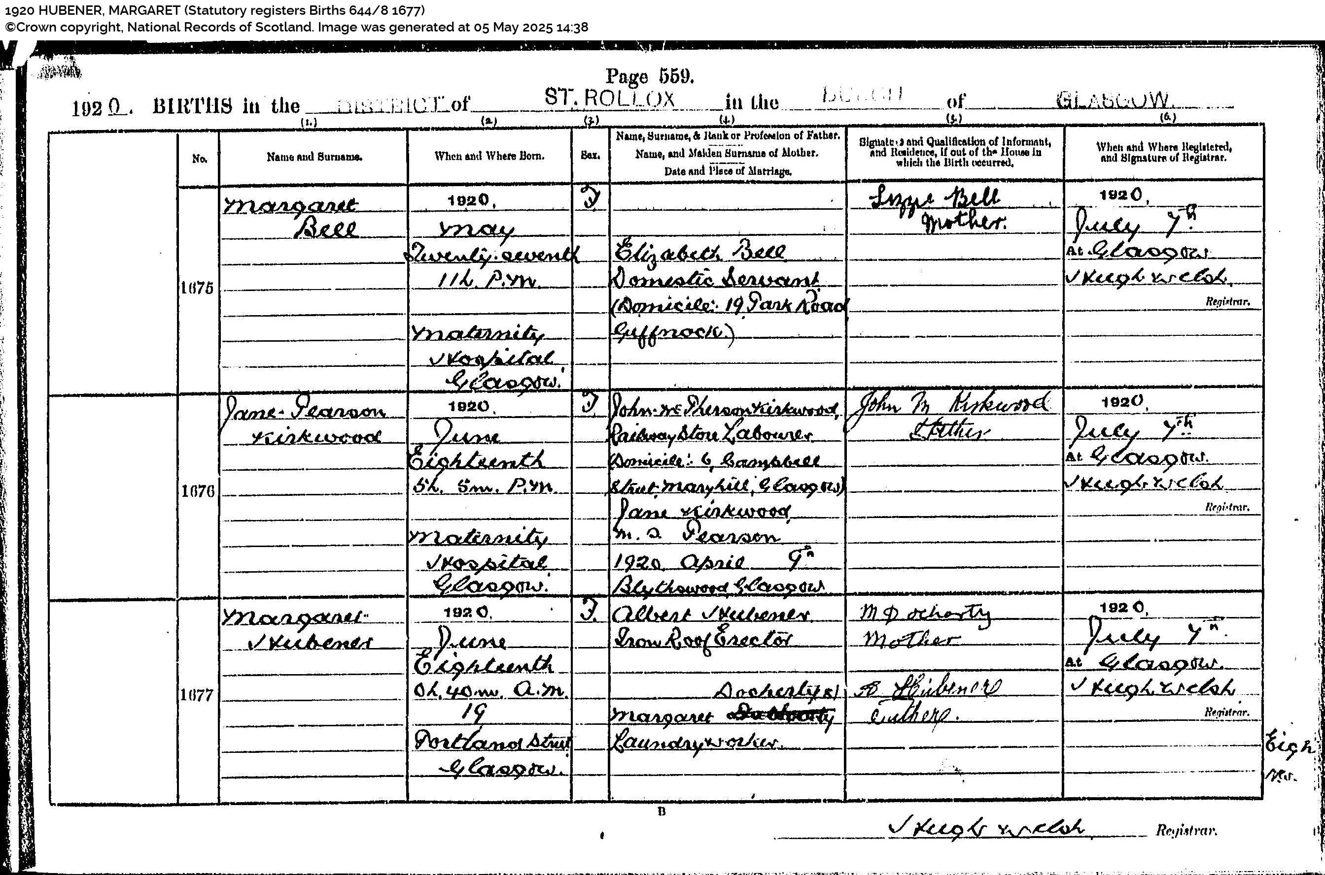 Birth of Margaret Hubener 18 June 1920 Scotland’s People. Scotland Statutory Birth Registers 1920 HUBENER, MARGARET (Statutory registers Births 644/8 1677) Page 559 Item 1677.