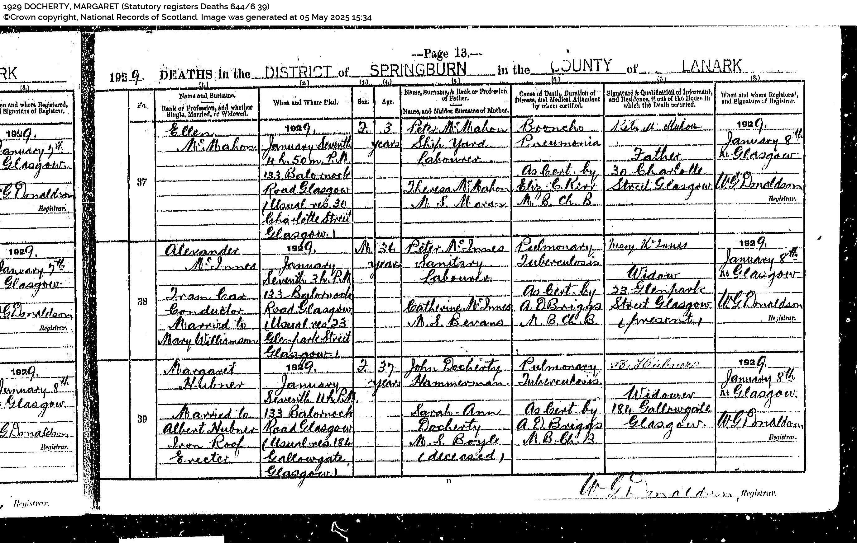 Death of Margaret Hubner or Docherty 17 Jan 1929 at Stobhill Hospital, Glasgow. Scotland’s People. Scotland Statutory Death Registers 1929 DOCHERTY, MARGARET (Statutory registers Deaths 644/6 39) Page 13 Item 39