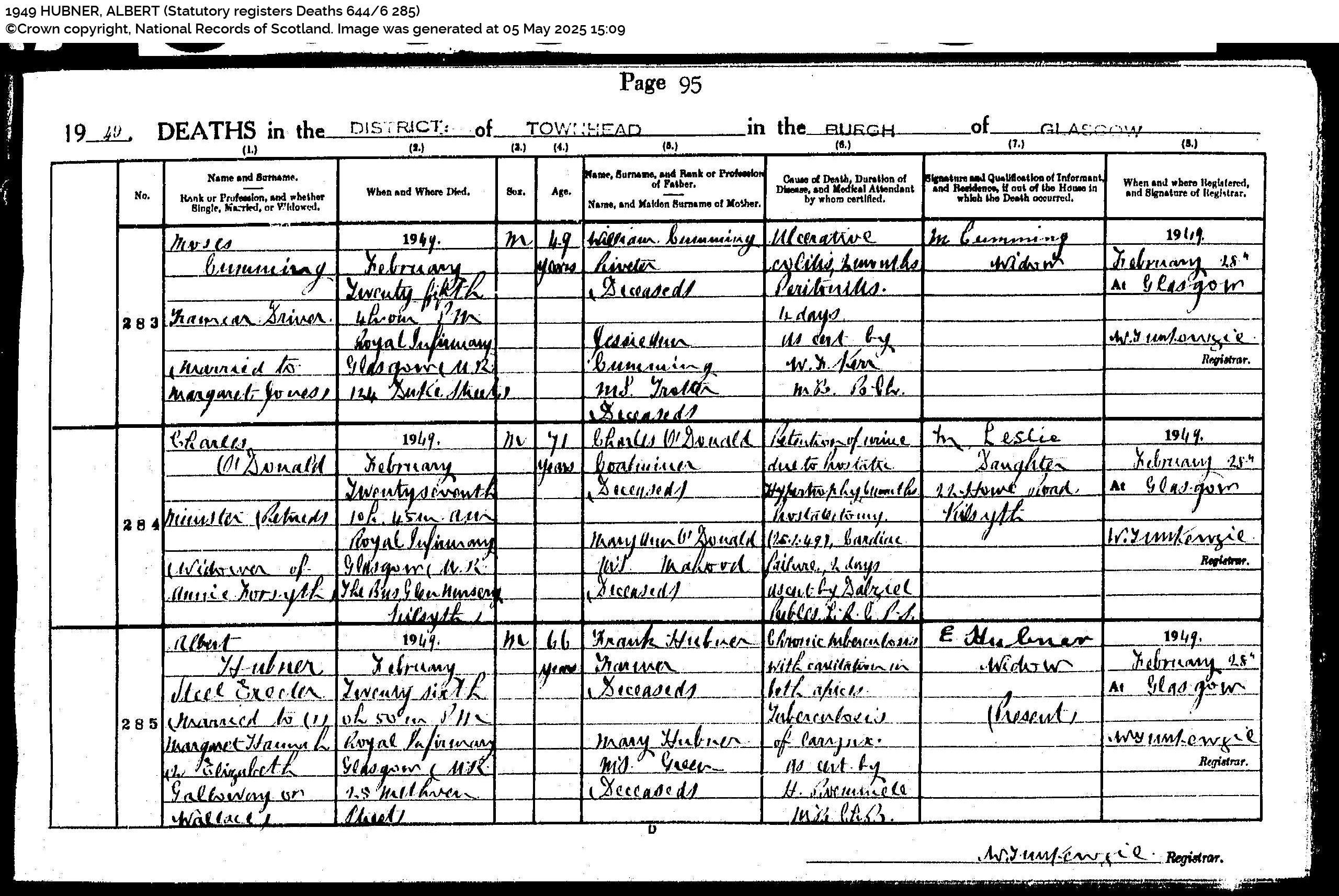 Death of Albert Hubner 26 February 1949 Scotland’s People, Scottish Statutory Death Registers Ref 1949 HUBNER, ALBERT (Statutory registers Deaths 644/6 285) Page 95 Item 285
